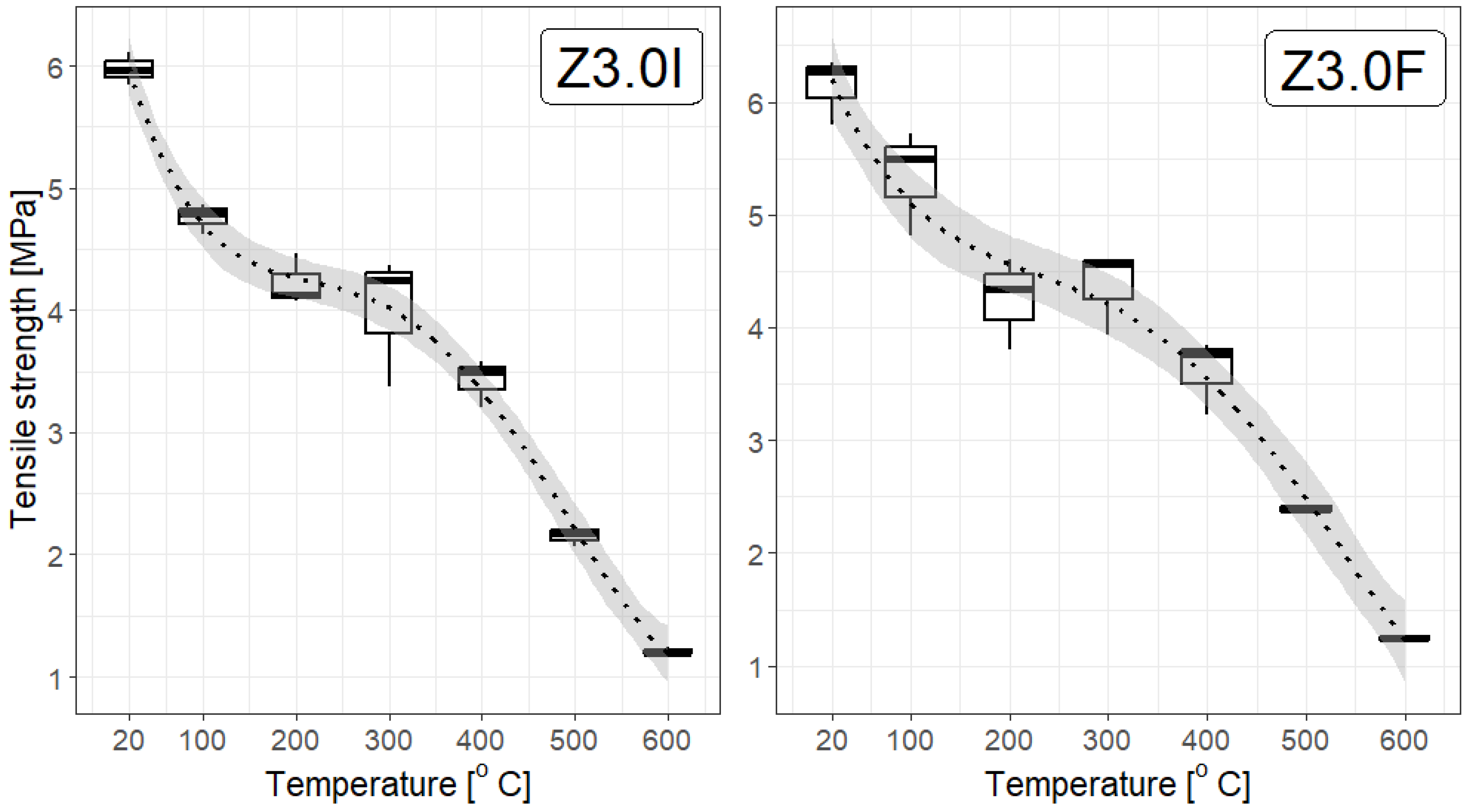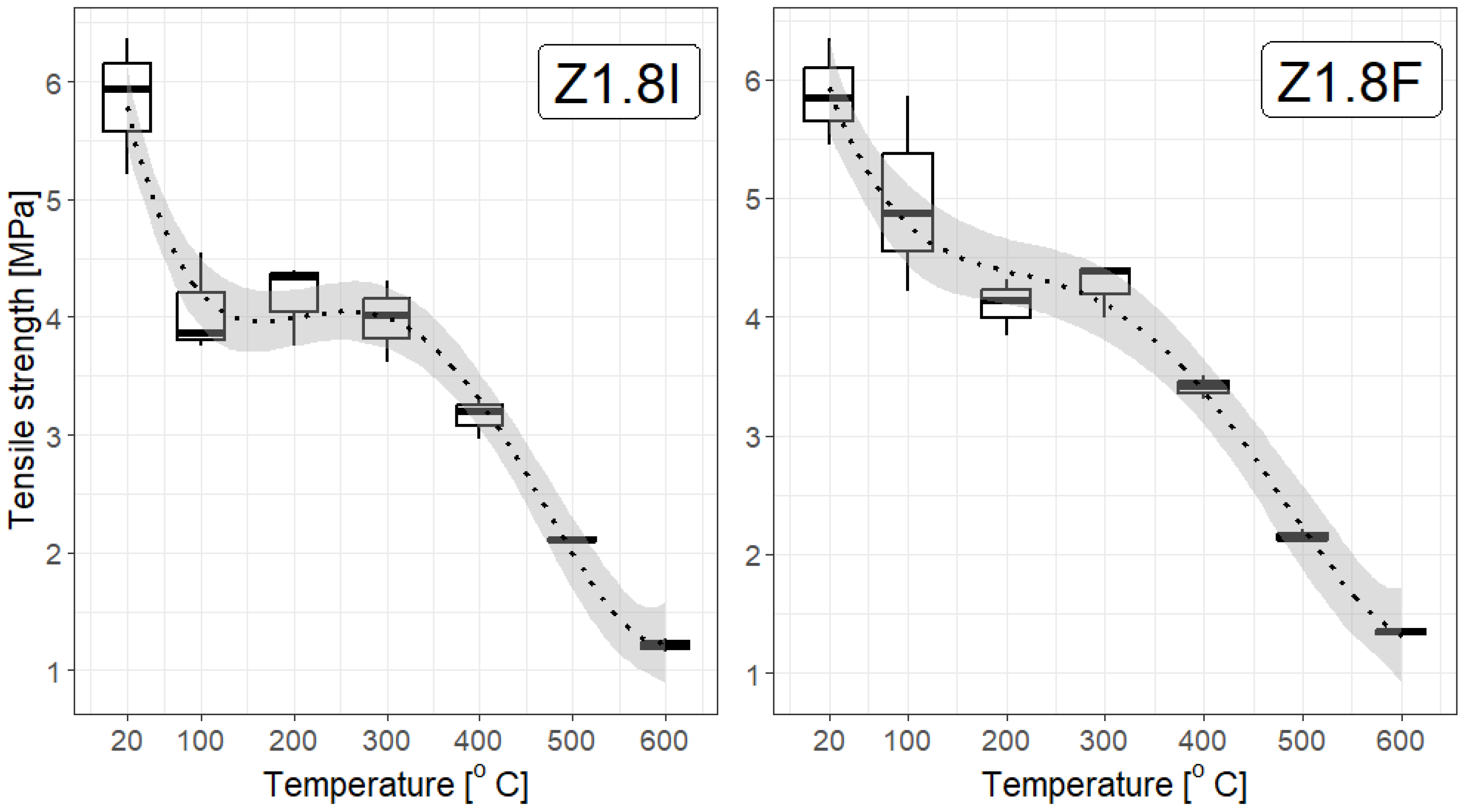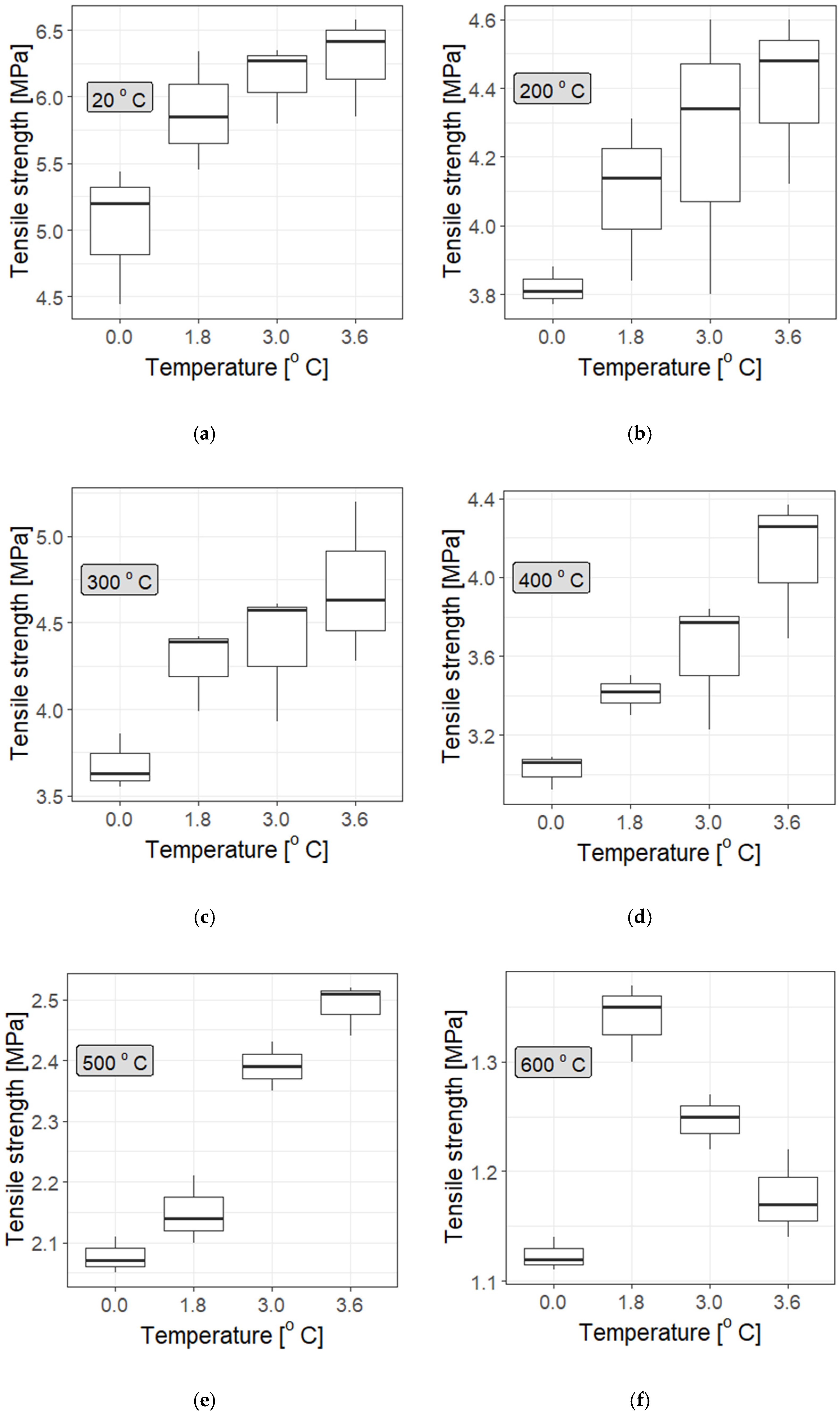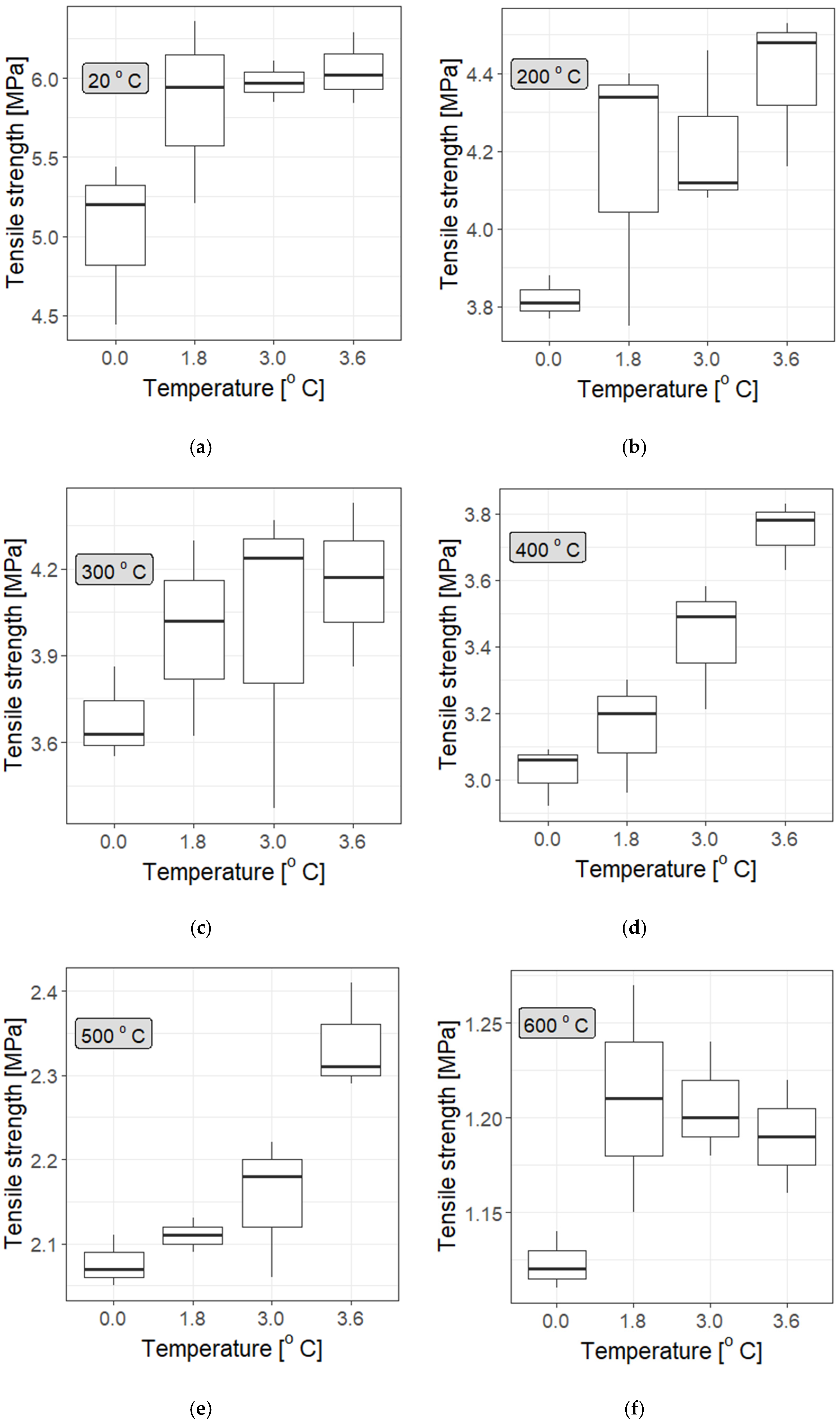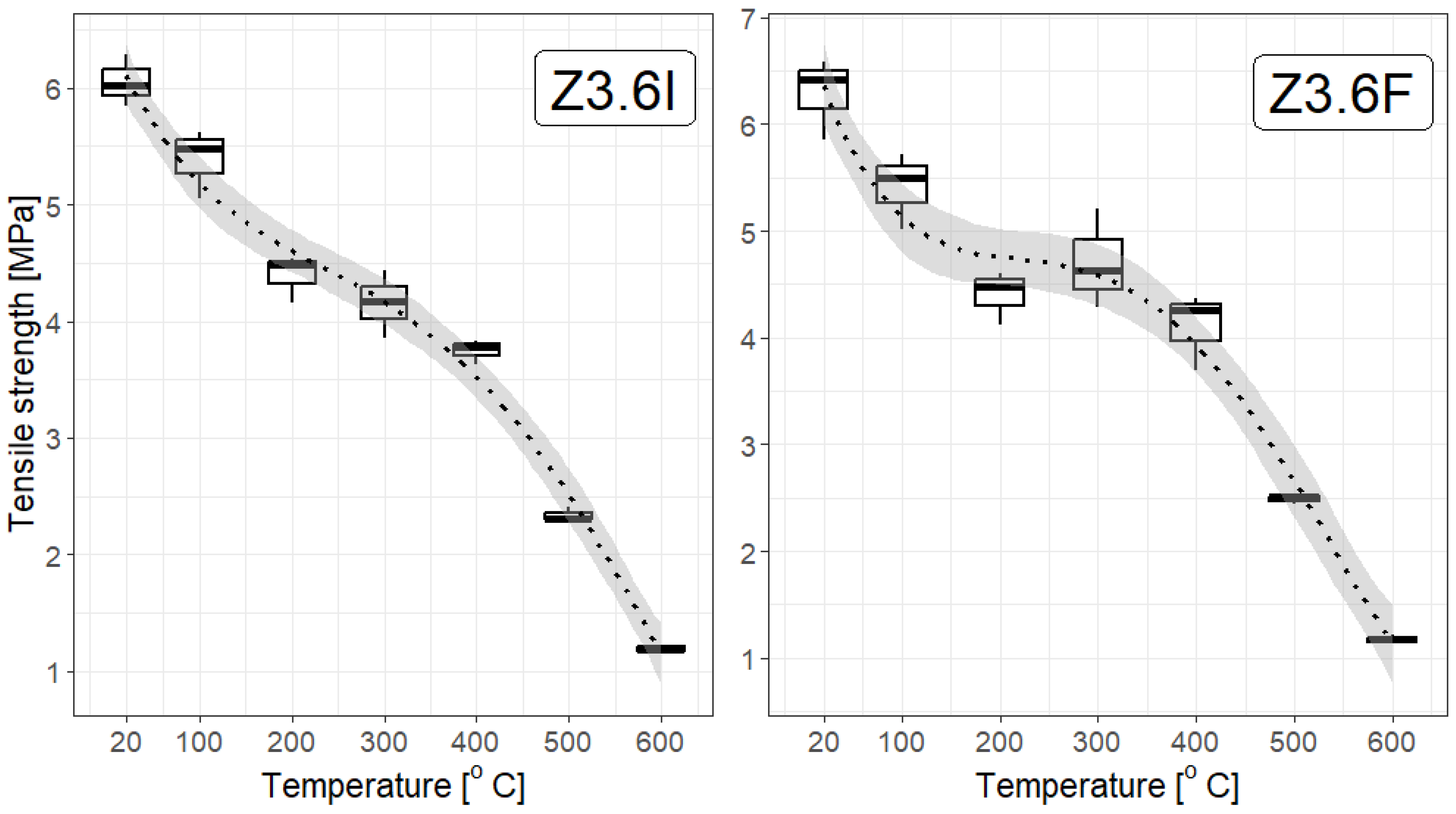 - Practically, there is rather little difference in the tensile strength of the specimens depending on the fibre concentrations; at most temperatures, there does not seem to be a convincing difference among concentrations of 1.8 kg/m3, 3.0 kg/m3, and 3.6 kg/m3. However, statistical tests provide some information for mortar samples with added F fibre at 3.6 kg/m3, but not at a high confidence level (which proves that more studies should be performed). This is particularly evident at higher temperatures, which aligns with the general properties of polypropylene fibres: they soften at temperatures below 200 °C and melt above 300 °C;