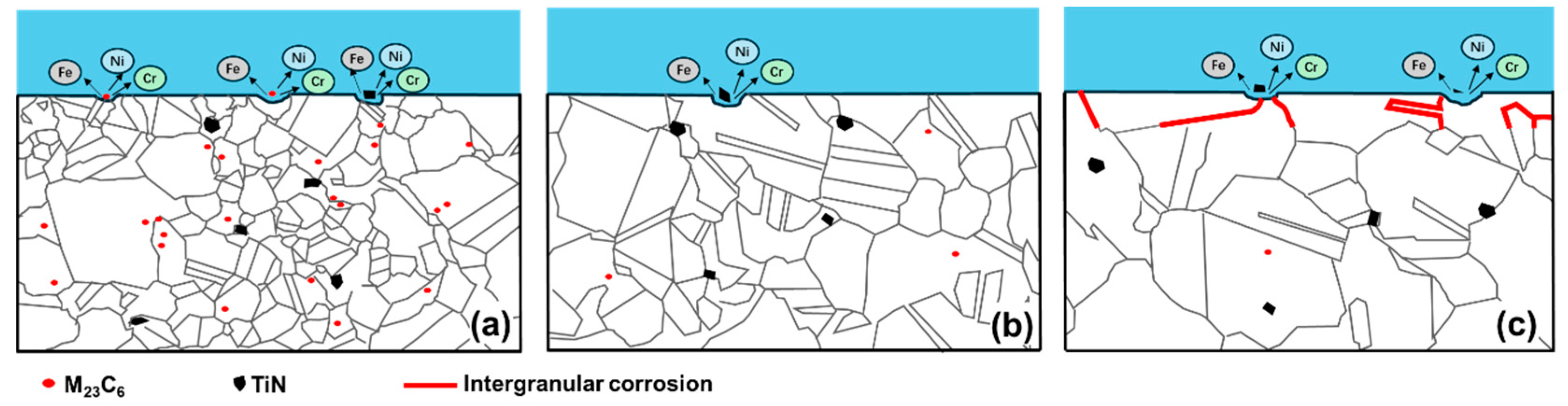 - For 800H heat treated at 1120 °C, the widely distributed Cr-carbides and TiN inclusions formed galvanic-type corrosion cells within the matrix and resulted in corrosion pit initiation. In comparison, 800H heat treated at 1150 °C demonstrated less corrosion attack due to the dissolved Cr-carbides. However, as the solid solution temperature increased to 1180 °C, IGC sensitivity increased and IGC became the dominant failure form.