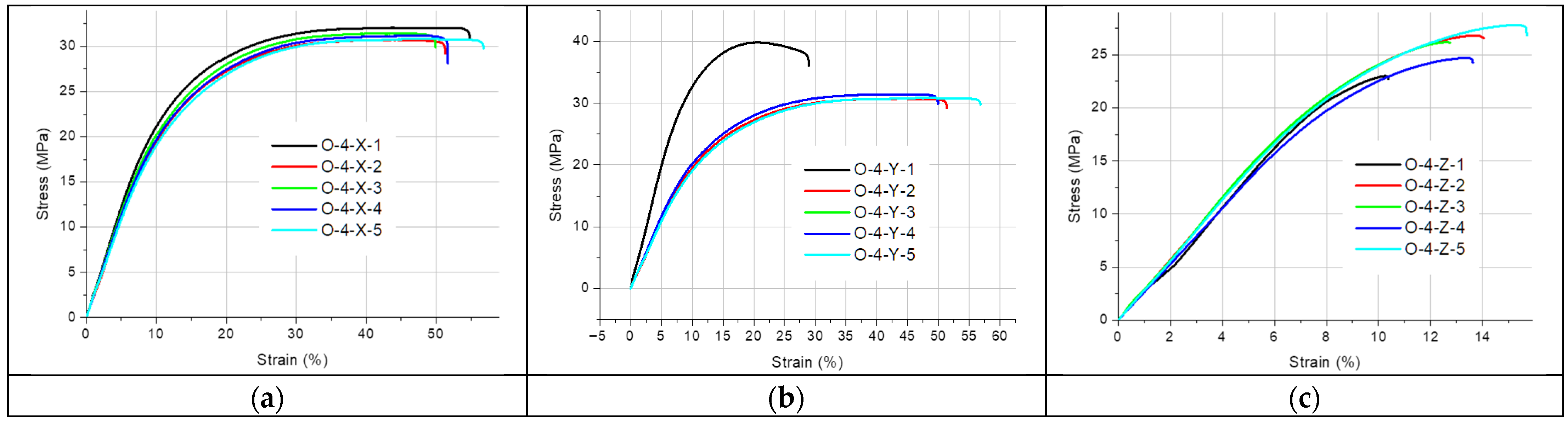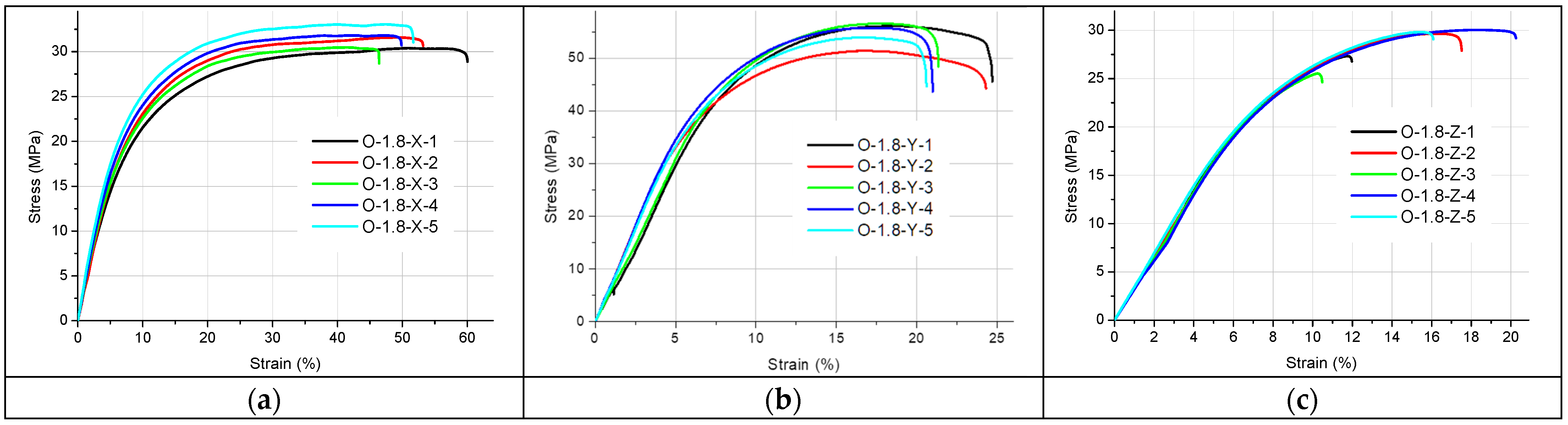 - The tensile strength and strain at break, as well as other mechanical property indices, depend on the printing direction, i.e., orientation on the build platform (anisotropy).