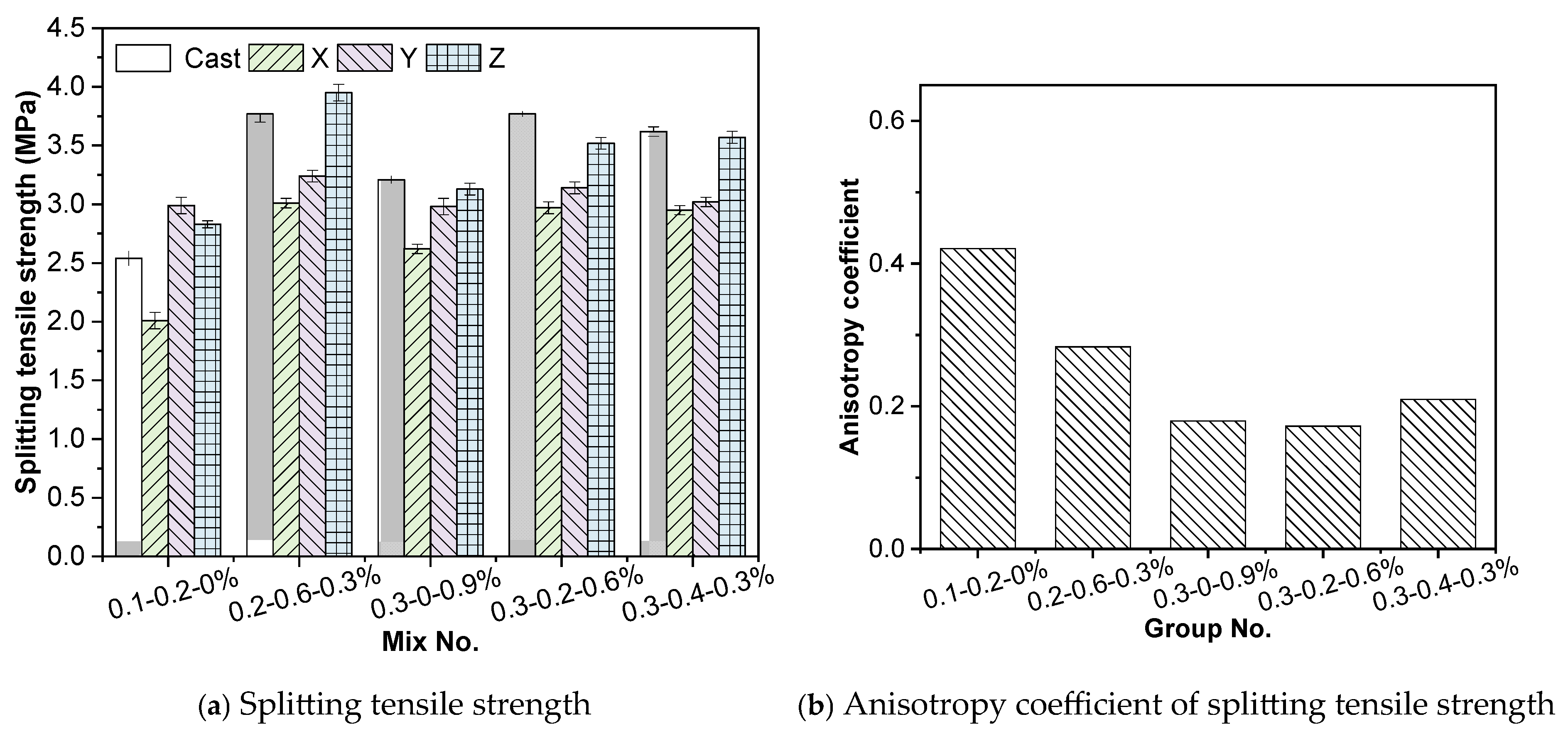 - The mixtures showed clear mechanical anisotropy: compressive strength was highest in the X-direction, splitting and flexural strength peaked in the Z-direction, while the lowest values appeared in the X-direction. Higher steel slag and iron tailings sand replacement ratios led to notable strength improvements.