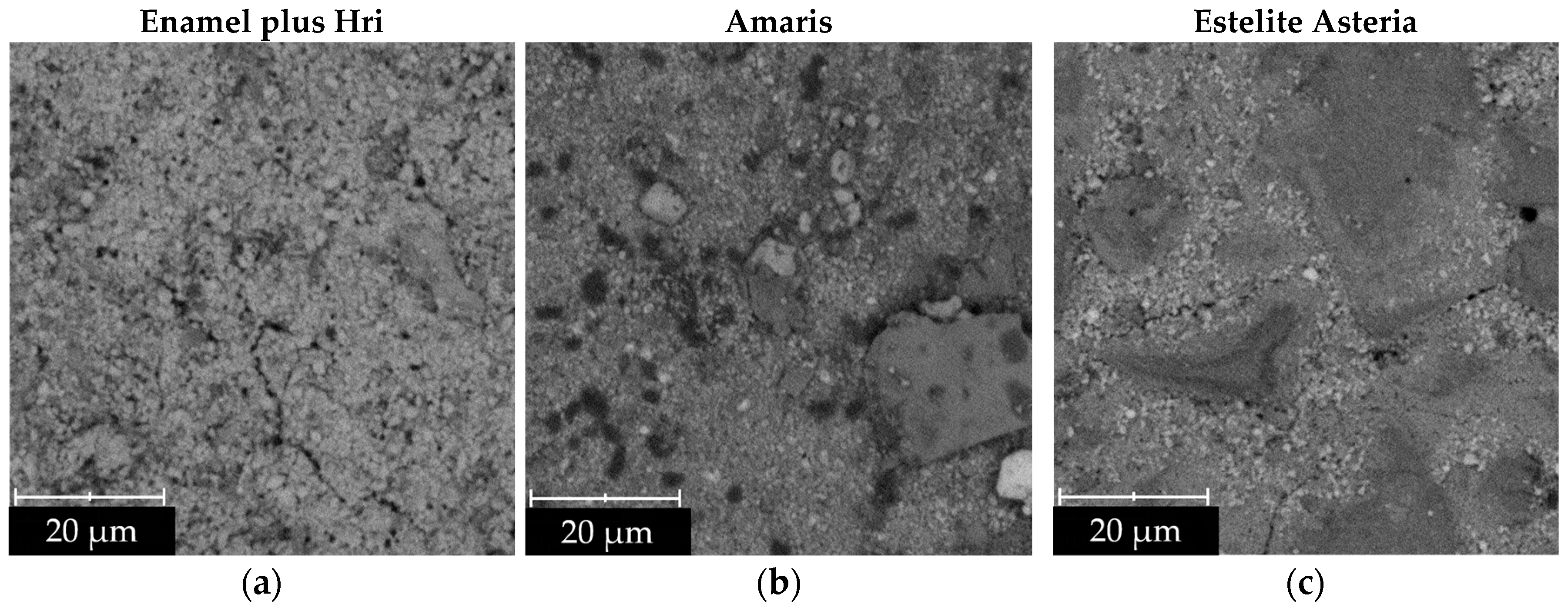 Representative SEM images of dental materials: Enamel plus Hri (a), Amaris (b), and Estelite Asteria (c).