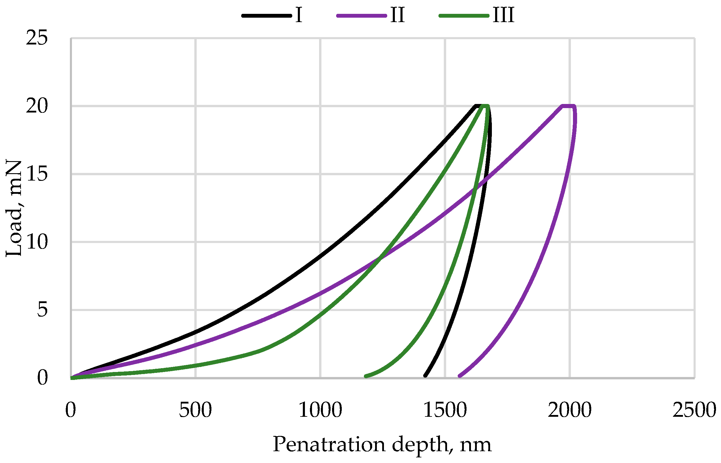 Representative graphs of loading–unloading curves as a function of indenter penetration depth: Enamel plus Hri (I), Amaris (II), and Estelite Asteria (III).