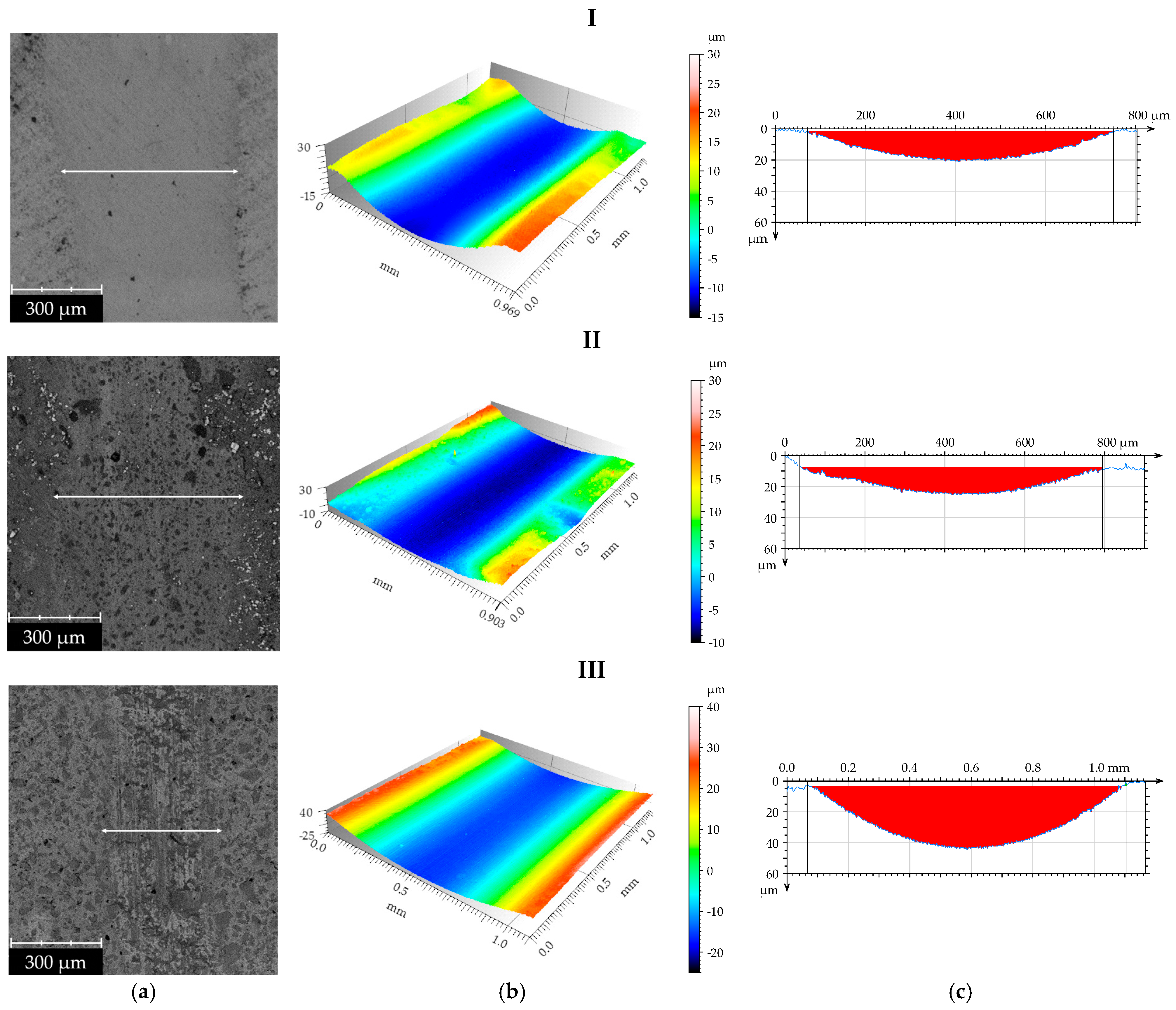 Surface texture after tribological tests: Representative SEM images (a), three-dimensional axonometric views (b), and profiles (c) of dental materials: Enamel plus Hri (I), Amaris (II), and Estelite Asteria (III).