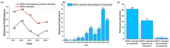(a) The number of retrieved publications in the past five years searched by different keywords in the Web of Science (WOS) database as of 8 November 2025. (b) The proportion of the applications of flame-retardant MOFs in thermoplastic polymers among their total applications in all polymers in the WOS database as of 8 November 2025. (c) The proportion of the number of review articles retrieved from WOS using “MOFs retardant”, “MOFs retardant polymer” and “MOFs retardant thermoplastic” as keywords, as of 8 November 2025.