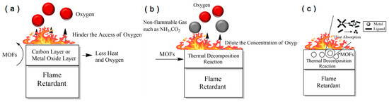 (a) MOF-catalyzed carbon layer (b); MOF gas-phase dilution (c); MOF endothermic heat absorption.