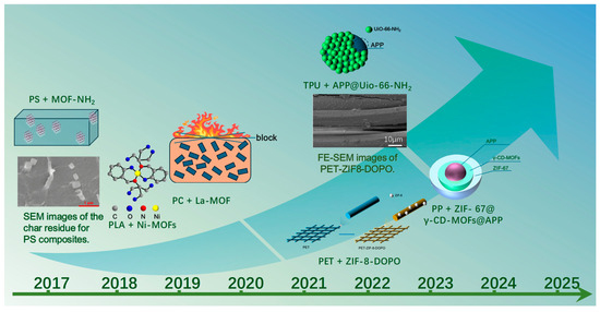 Representative examples of flame-retardant MOFs used in six major thermoplastic matrices and their first-reported timeline. Some subfigures in this illustration are directly reproduced from Refs. [38,39] and are labeled in accordance with the relevant copyright requirements.