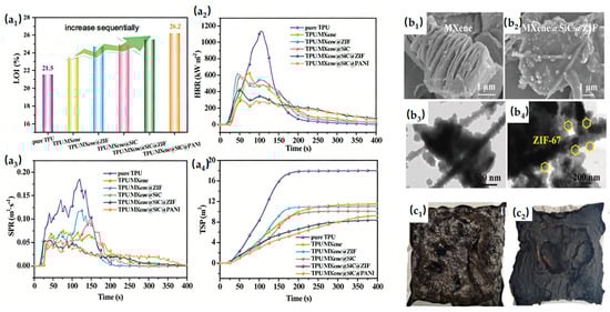 (a1–a4) Test data of pure TPU, TPU/MXene, TPU/MXene@ZIF, TPU/MXene@SiC, TPU/MXene@SiC@ZIF and TPU/MXene@SiC@PANI: (a1) LOI values, (a2) HRR; (a3) SPR; (a4) TSP. (b1–b4) (b1,b2) SEM image of MXene and MXene@SiC@PANI; (b3,b4) TEM image of MXene@SiC@ZIF, reproduced with permission from ref. [59]. (c1,c2) The digital combustion pictures: (c1) TPU/10SiAPP-NH2@1MOFs, (c2) TPU/1SiAPP-NH2@1MOFs. Reproduced with permission from ref. [60].