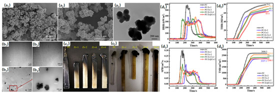 (a1–a3) SEM (a1,a2) and TEM (a3) images of Zr-BDC. (b1–b4) TEM images of PC (b1,b2) and PC/Zr−4 (b3,b4) at different magnifications. (c1,c2) Photos of samples after UL-94 vertical burning test (c1) and LOI test (c2). Reproduced with permission from ref. [83]. (d1–d4) HRR (d1), THR (d2), SPR (d3) and TSR (d4) verse time plots of PC and its composites. Reproduced with permission from ref. [84].