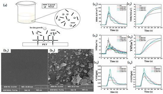 (a) Schematic Diagram of MOF Growth on PET Substrate. (b1,b2) SEM image of untreated samples (b1) and ZnO based MOF treated samples (b2). Reproduced with permission from ref. [93] (c1–c6) P CONE test results of PET and MOF-PET: HRR curves (c1); THR curves (c2); SPR curves (c3); TSP curves (c4); CO production curves (c5); and CO2 production curves (c6). Reproduced with permission from ref. [91].
