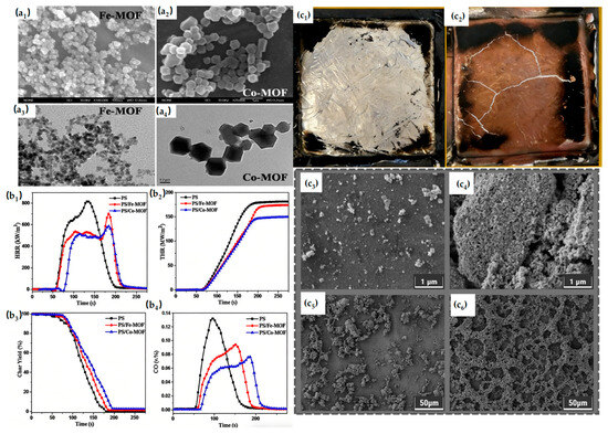 (a1–a4) SEM (a1,a2) and TEM (a3,a4) images of MOFs. (b1–b4) HRR (b1), THR (b2), weight loss (b3), and CO (b4) curves of PS and its composites obtained by cone calorimetry. Reproduced with permission from ref. [94] (c1–c6) Digital pictures of char residues of (c1) PS; (c2) PS/T-Fe-3.0. SEM images of char residues of (c3,c4) PS and (c5,c6) PS/T-Fe-3.0. Reproduced with permission from ref. [100].