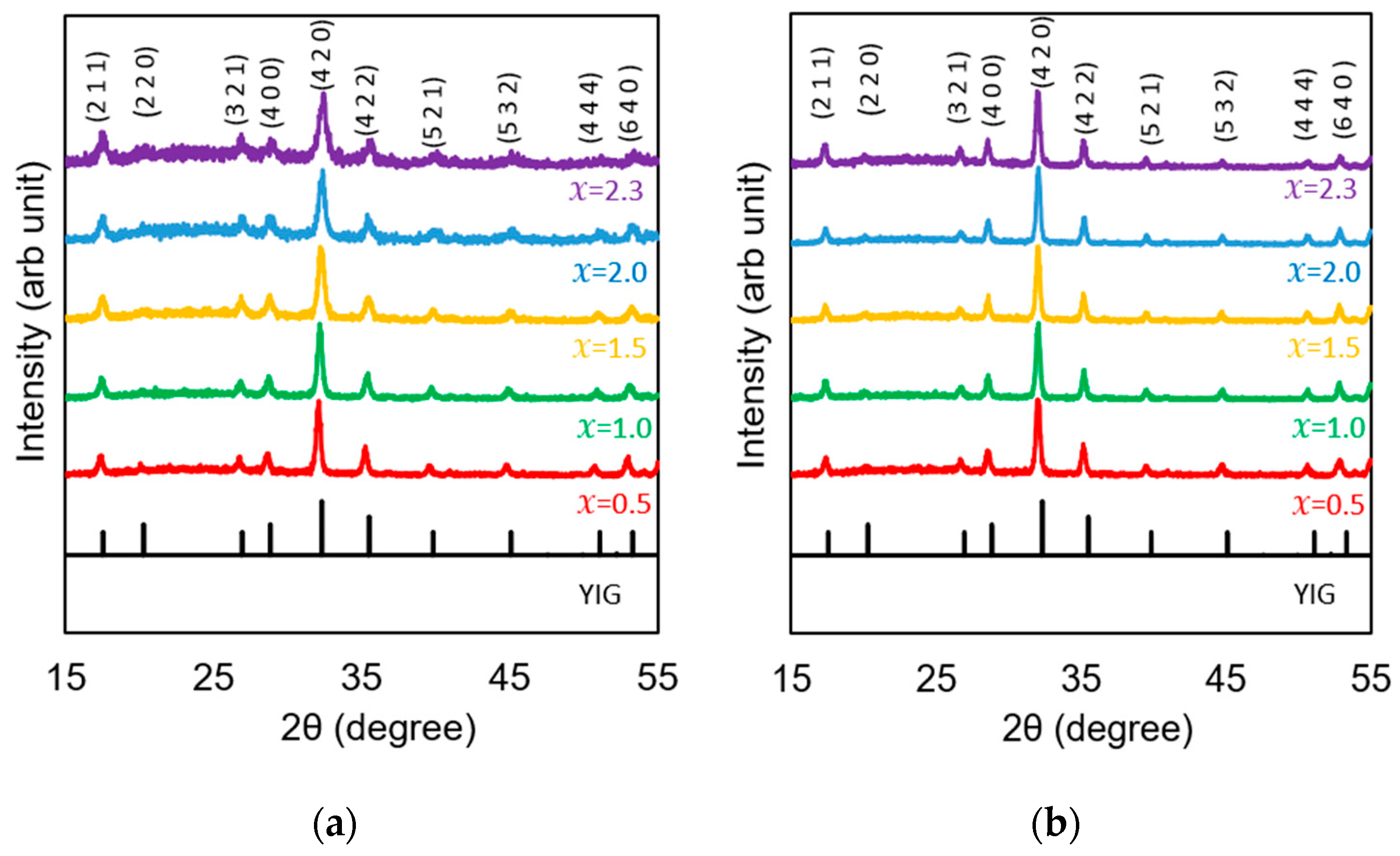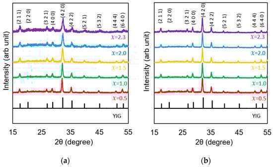 - Musa, M.A.; Azis, R.A.S.; Osman, N.H.; Hassan, J.; Zangina, T. Structural and magnetic properties of yttrium iron garnet (YIG) and yttrium aluminum iron garnet (YAlG) nanoferrite via sol–gel synthesis. Results Phys. 2017, 7, 1135–1142. [Google Scholar] [CrossRef]