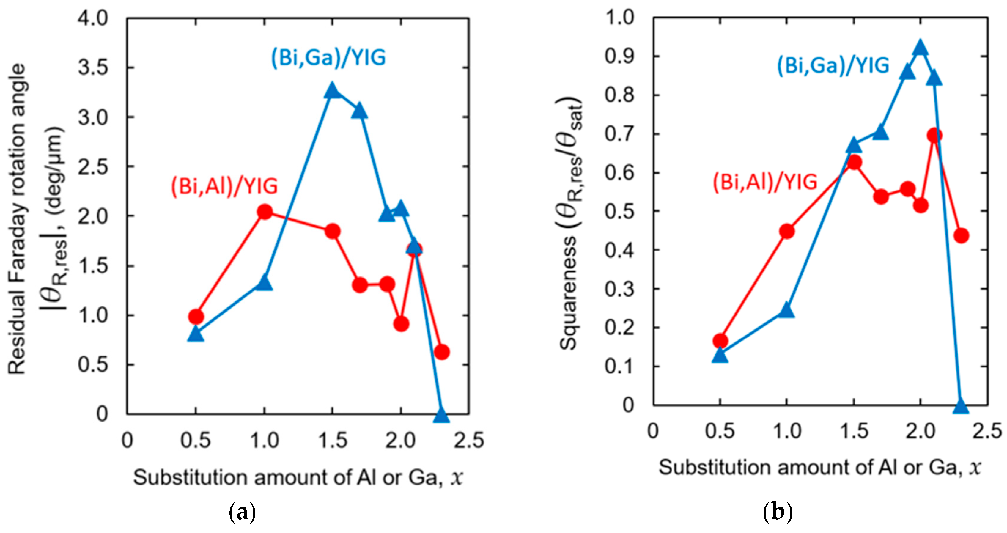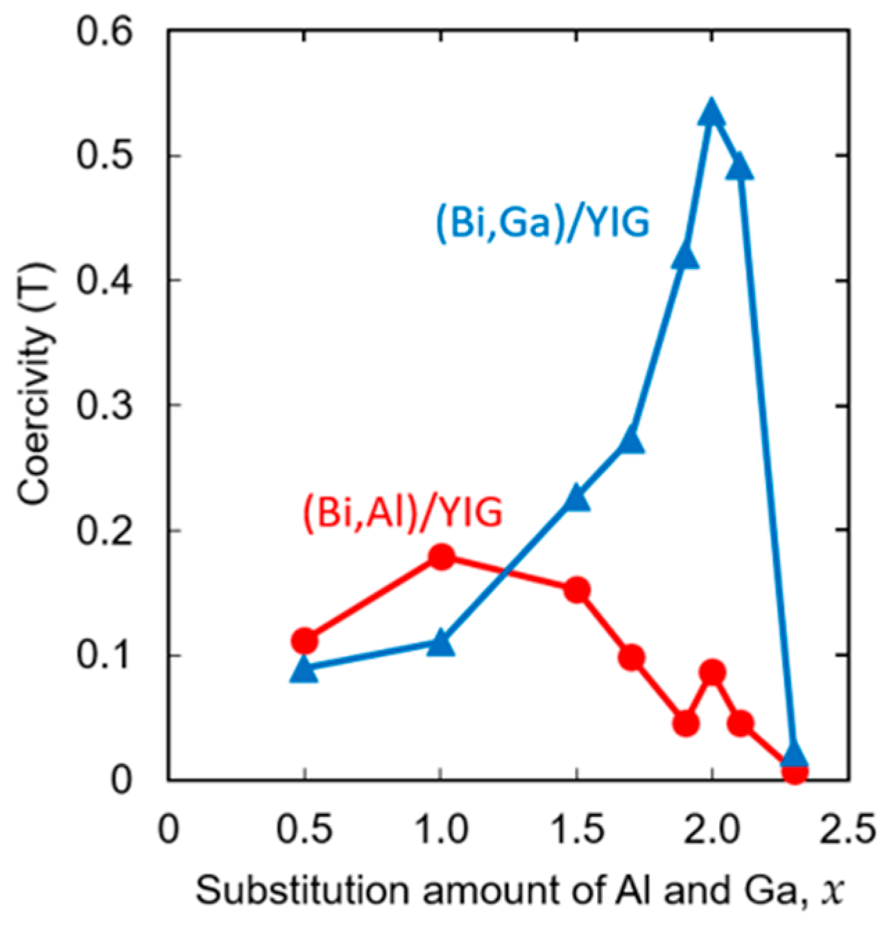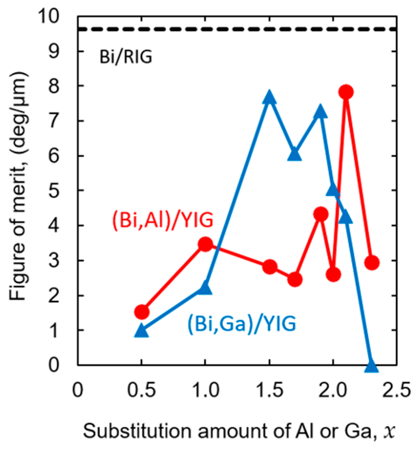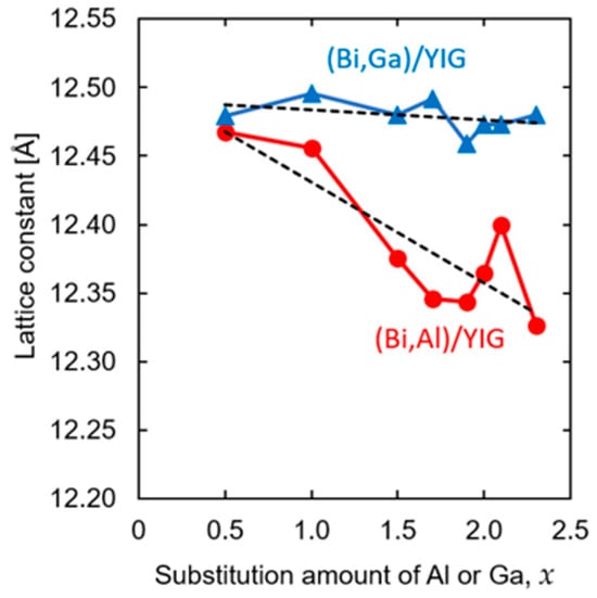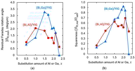 - Sasaki, M.; Lou, G.; Liu, Q.; Ninomiya, M.; Kato, T.; Iwata, S.; Ishibashi, T. Nd0.5Bi2.5Fe5−yGayO12 thin films on Gd3Ga5O12 substrates prepared by metal–organic decomposition. Jpn. J. Appl. Phys. 2016, 55, 055501. [Google Scholar] [CrossRef]