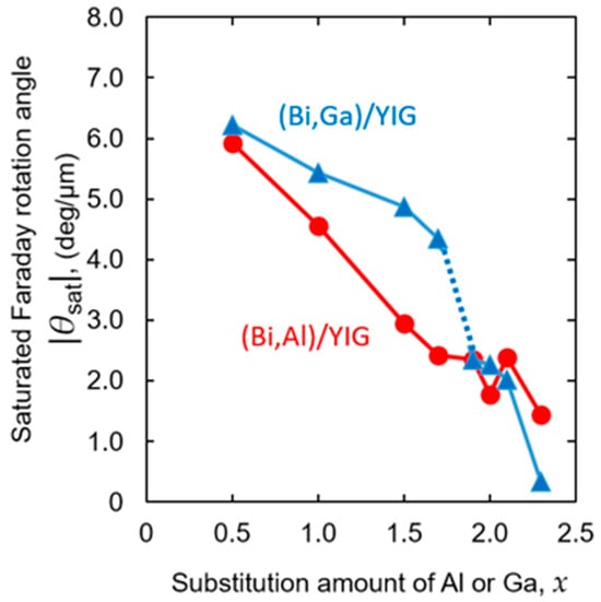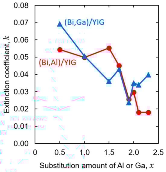- Kuroda, C.S.; Kim, T.Y.; Hirano, T.; Taniyama, T.; Yamazaki, Y. Effects of the substitution of non-magnetic ions in Bi-YIG coating films on the magneto-optical properties. J. Jpn. Soc. Powder Powder Metall. 2000, 47, 203–207. [Google Scholar] [CrossRef]