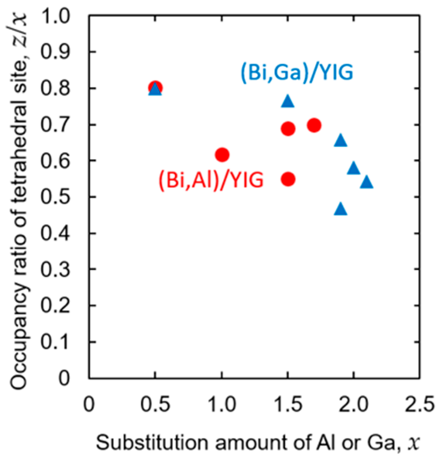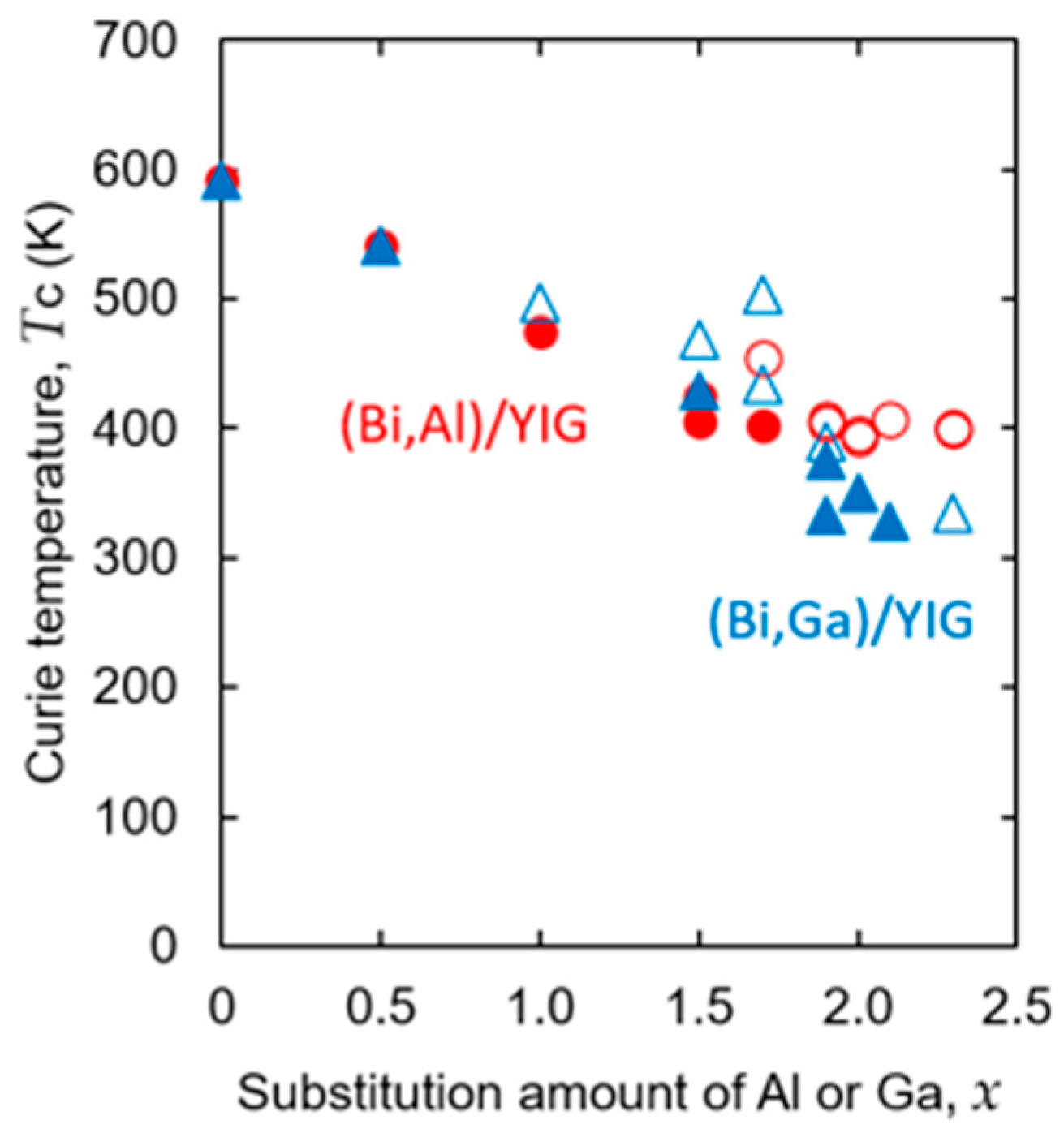 | x (Al/Ga) | TC for (Bi,Al)/YIG) [K] | z/x for (Bi,Al)/YIG | TC for (Bi,Ga)/YIG) [K] | z/x for (Bi,Ga)/YIG |