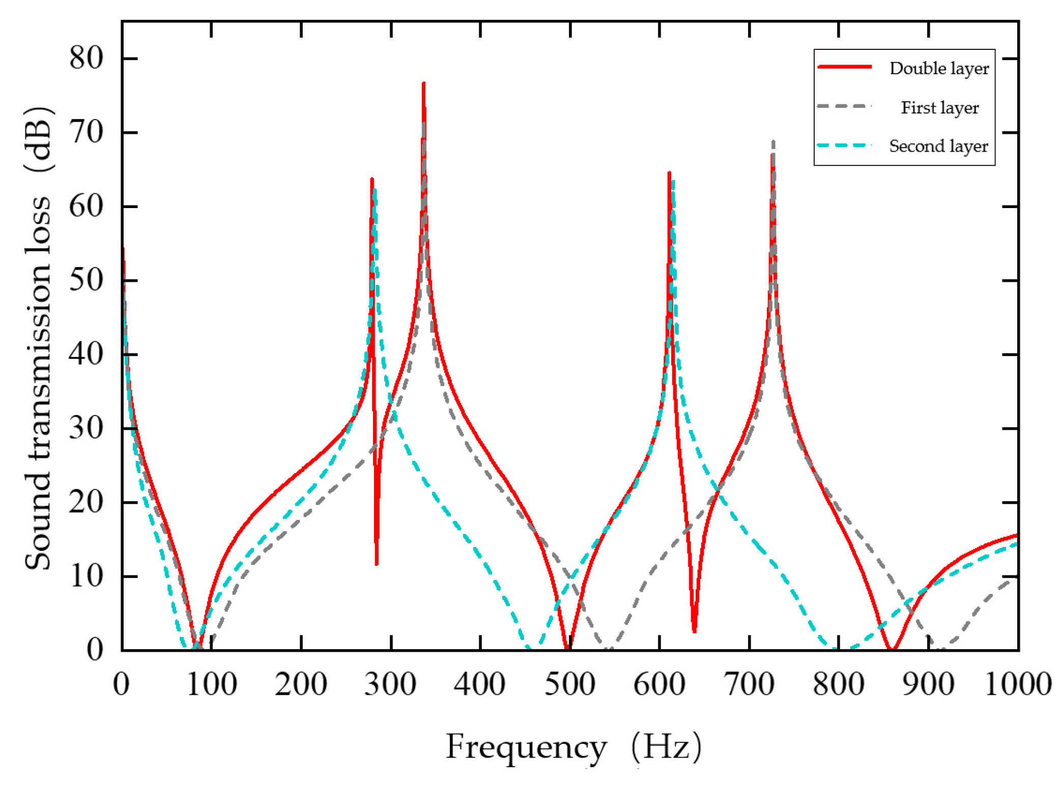 2.2.4. Sound Insulation Performance of Double-Layer Thin-Plate Acoustic Metamaterials