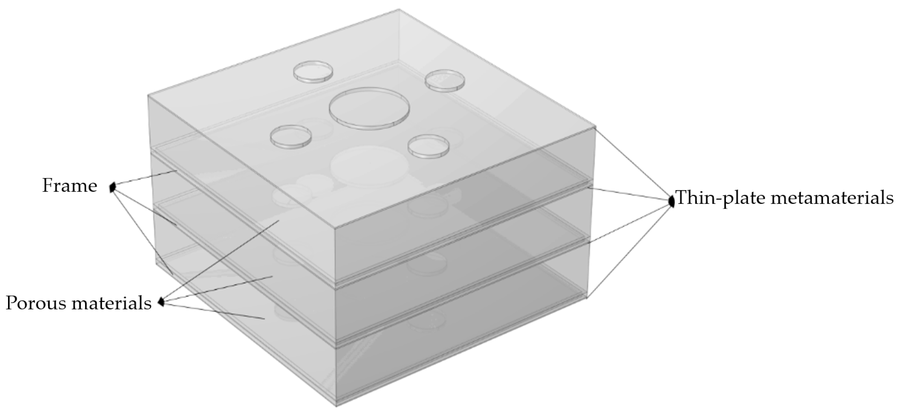 - Lin, Q.; Lin, Q.; Wang, Y.; Di, G. Sound insulation performance of sandwich structure compounded with a resonant acoustic metamaterial. Compos. Struct. 2021, 273, 114312. [Google Scholar] [CrossRef]