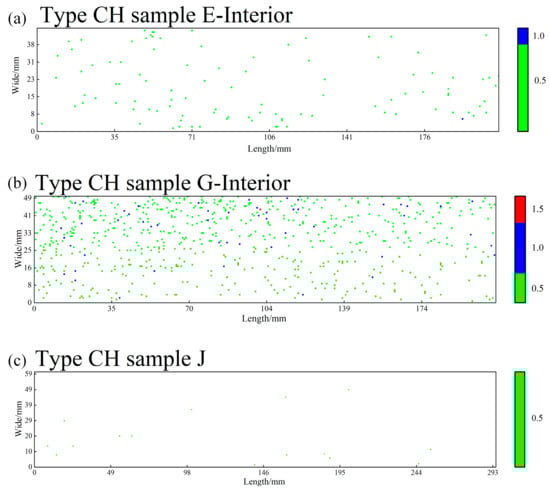 Figure 6 is highly consistent with the spatial distribution characteristics displayed in the rating cloud maps. In the tail of the ESR ingot, although Table 5 indicates that the total number of Type C inclusions reaches 1767, the rating cloud maps reveal significant clustered aggregation of Type C inclusions in this region. This localized enrichment directly leads to the abnormally high number density value observed there. Furthermore, data from Table 4 show that in the tail of the ESR ingot, Type C heavy series (CH) inclusions reach 103 and 7 fields at grades 1.0 and 1.5, respectively, confirming that this region contains not only a large quantity of inclusions but also inclusions with higher severity ratings. In contrast, the forged billet exhibits a significantly reduced number density, particularly in the tail section, where it reaches an extremely low level. This is consistent with the light-colored, uniform distribution shown in the corresponding rating cloud maps.