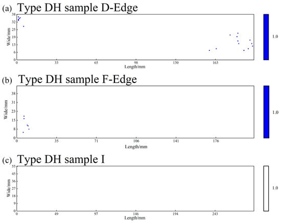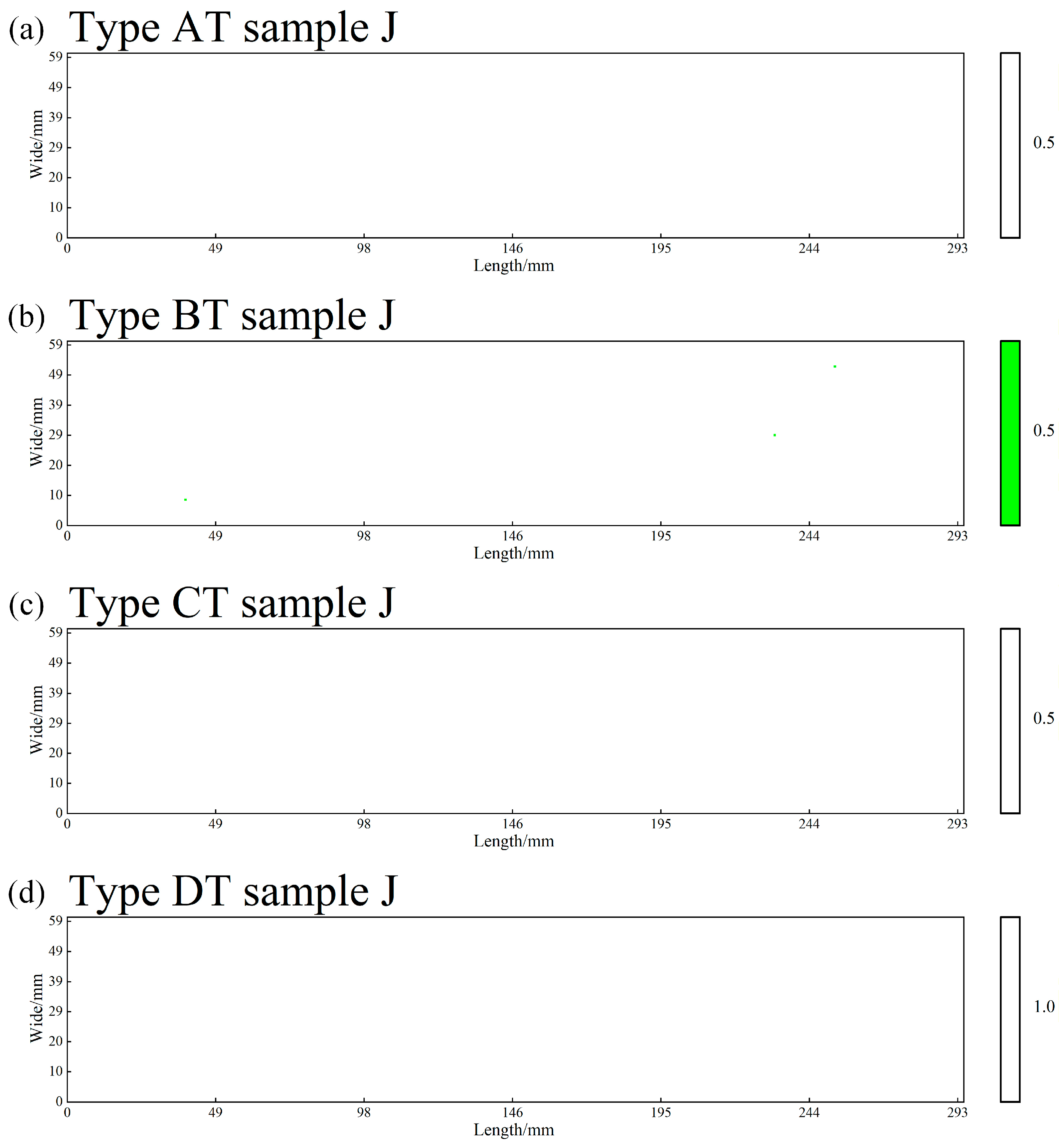 Figure 5. Rating distribution maps of the four types of thin series inclusions in the tail of the forged billet: (a) Type A thin series, (b) Type B thin series, (c) Type C thin series, (d) Type D thin series.