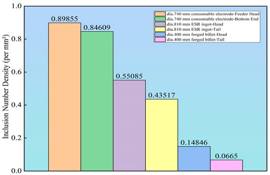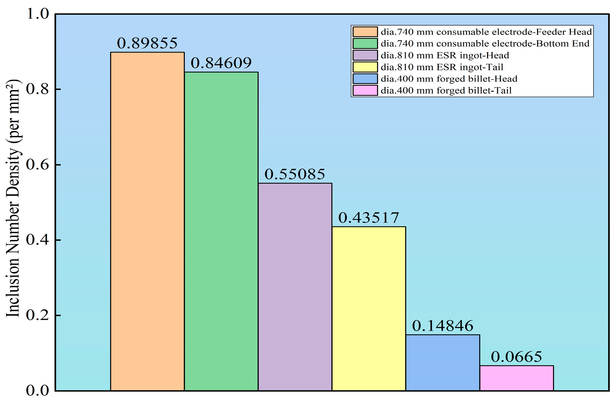 The most pronounced reduction in inclusion count occurs during the transition from the ESR ingot to the forged billet, indicating that hot deformation further promotes the fragmentation, dispersion, and even dissolution of inclusions.