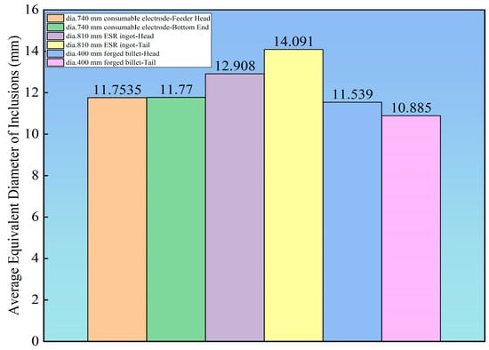 Figure 7 demonstrates a strong correlation between the evolution of inclusion size and the field count statistics by severity rating. During the ESR process, although the total number of Type D (globular oxides) decreased from approximately 10,000 in the consumable electrode to between 4000 and 7000 in the ESR ingot (Table 5), the average equivalent diameter may have increased due to the preferential flotation of smaller inclusions. This observation aligns with the relative stability in the number of fields rated at grade 1.0 for Type D heavy series (DH) inclusions shown in Table 4. A significant reduction in the average equivalent diameter was achieved during the forging stage. Particularly in the tail of the forged billet, Table 3 shows that the quantities of all inclusion types dropped to very low levels, while the corresponding average equivalent diameter in Figure 7 also reached its minimum. This confirms that the forging process effectively refined the inclusion sizes, which is fully consistent with the fine and dispersed distribution characteristics displayed in the rating cloud maps.