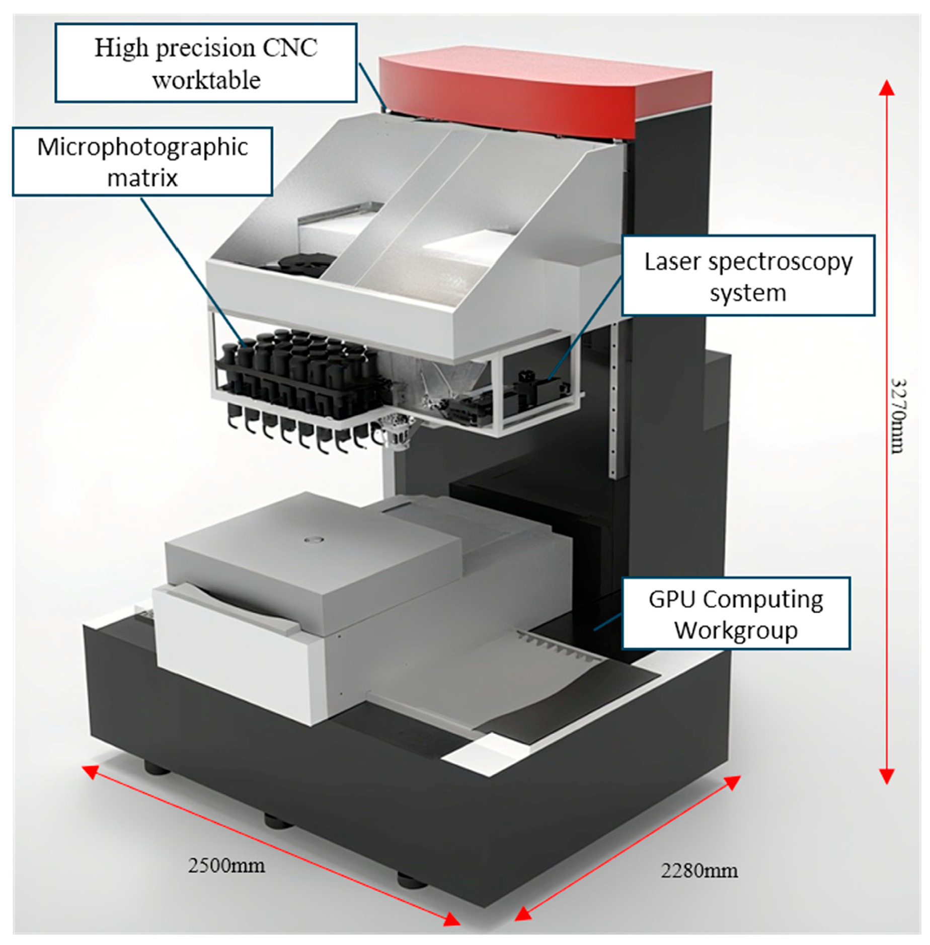By integrating parallel image acquisition with high-performance computing, the metallographic microscope matrix system achieves efficient, full-range analysis of large samples. The system comprises 24 synchronously operating microscopic imaging units. Under the coordination of central control software, these units perform rapid concurrent image acquisition from different regions of the sample surface, significantly enhancing inspection efficiency. Following acquisition, the process seamlessly proceeds to an integrated data processing pipeline. Leveraging the parallel computing power of a GPU, the system performs high-speed preprocessing and intelligent analysis of the massive image dataset. Each metallographic image undergoes a series of processing operations—including cropping, binarization, rotation, scaling, and secondary cropping—within 0.7 s. This ensures that all images maintain consistency in orientation and magnification with the coordinate system of the precision motion stage. Following the automated panoramic stitching of images based on their precise spatial coordinates—which generates a complete metallographic map of the large-scale sample for the rapid identification, localization, and statistics of inclusions—the system further enhances analytical accuracy by integrating with Laser-Induced Breakdown Spectroscopy (LIBS). This coupled setup enables in situ micro-area compositional analysis of typical inclusions previously identified by the microscope matrix, facilitating their qualitative to semi-quantitative determination and thereby delivering reliable data for material performance evaluation and process optimization. Figure 1 shows a schematic diagram of the instrument structure. The detailed instrumentation and operating parameters are provided in Part I of the Supplementary Materials.