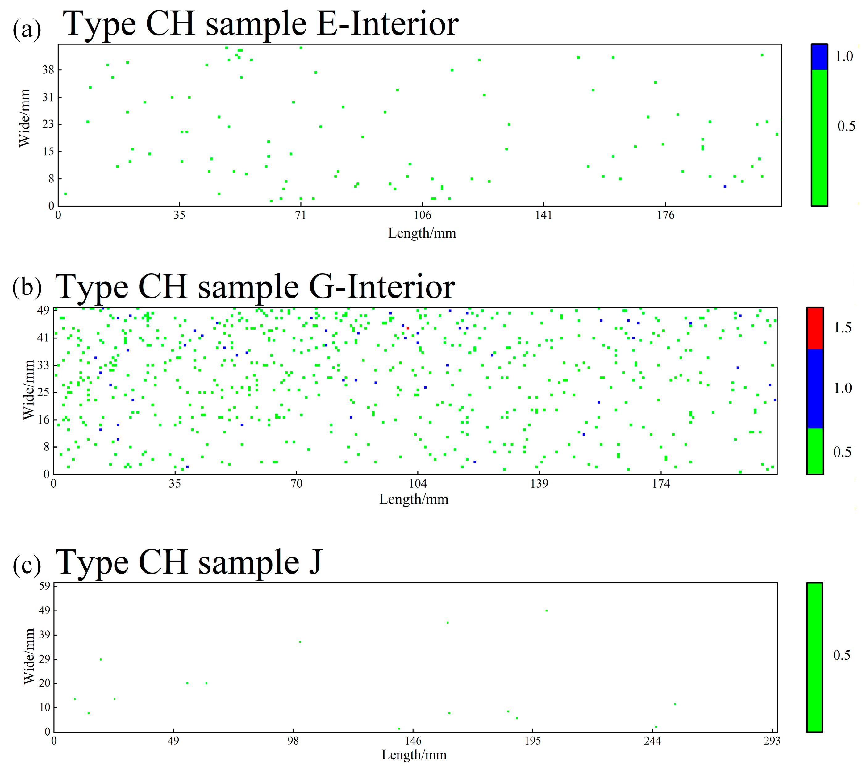 The distribution cloud maps clearly show that inclusions exhibit a non-uniform, clustered or banded distribution across the sample surface. In the tail section of the ESR ingot, Type C inclusions display a significantly high-density aggregation state (indicated by darker regions). This observation aligns with the statistical results, showing that the number of fields with Type C heavy series (CH) inclusions at the 0.5 grade level in this region reaches as high as 1211. In contrast, the inclusion distribution maps for the forged billet appear noticeably lighter in color overall, reflecting generally lower inclusion ratings and sparser distribution characteristics. Regarding process influence: a progressive homogenization of inclusion distribution and a reduction in severity ratings are observed from the consumable electrode to the ESR ingot and further to the forged billet. This trend reflects the effective role of ESR and forging processes in removing and refining inclusions.