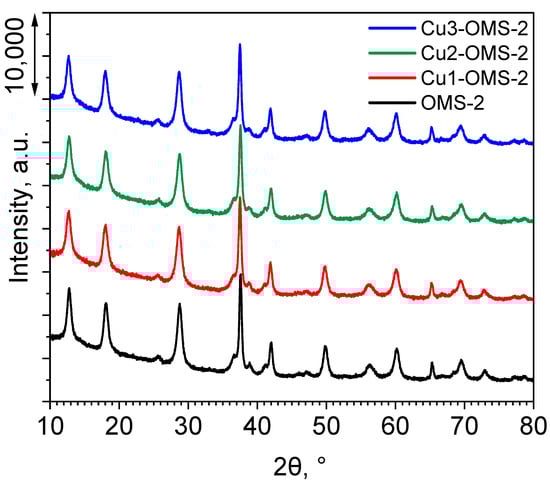 The XRD profiles of the investigated catalyst series are presented in Figure 1. For all the materials, characteristic reflexes appeared, which were consistent with the (PDF 44-1386), implying a successful synthesis of OMS-2 material [17,21,22]. The reflection peaks at specific 2θ values can be identified and the corresponding hkl Miller’s indices were attributed: 12.698° (1 1 0), 18.000° (2 0 0), 25.672° (2 2 0), 28.727° (3 1 0), 36.514° (4 0 0), 37.489° (2 1 1), 38.867° (3 3 0), 41.090° (4 2 0), 41.883° (3 0 1), 49.748° (4 1 1), 56.157° (6 0 0), 60.096° (5 2 1), 65.309° (0 0 2), 69.482° (5 4 1), and 72.849° (3 2 1). Introduction of copper during the synthesis stage did not influence the XRD pattern of the Cu-doped materials in comparison to pristine OMS-2 material. Also, no additional reflections originating from Cu species were observed, which can be due to the low amount of copper within the CuX-OMS-2 (X = 1,2,3) being below the detection limit of the apparatus or fine dispersion of Cu within the material.