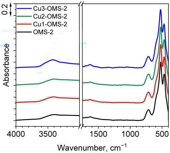 To gain a better understanding of the functional groups within the materials, FTIR measurements were conducted. The obtained spectra are presented in Figure 2. For all the materials, five peaks were identified at 3417, 1624, 702, 523, and 467 cm−1. First peak can be assigned as O-H stretching vibrations from water molecules adsorbed to the material. Its intensity slightly increased along with increasing dose of copper introduced to the material, which is related to increased hydrophilicity of the CuX-OMS-2 materials (X = 1,2,3). Also, the band at 1624 cm−1 is related to presence of bending O-H vibrations from water molecules over the material’s surface. Three wide bands at 702, 523, and 467 cm−1 are assigned to the MnO6 octahedral framework of cryptomelane (resulting from bending Mn-OH vibrations) as reported by Zong et al. [23]. No additional vibrations were observed for CuX-OMS-2 materials (X = 1,2,3), which can be related to low amount of copper within the obtained series and does not allow to track the increase in the share of oxygen vacancies over the catalysts’ surface [24].