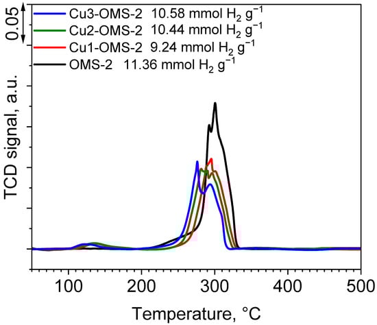 The profiles of H2-TPR tests are presented in Figure 5 and are consistent with the already published references [26,29]. The pristine OMS-2 exhibited three main reduction stages at about 250, 292, and 300 °C and is classified through step by step reduction of manganese species MnO2→Mn2O3→Mn3O4→MnO, respectively. Introduction of copper ions during the synthesis step caused a shift in the maximum reduction temperature towards lower temperatures (276 °C for Cu3-OMS-2) along with a growing content of Cu within the material. Also, the intensity of the reduction peak was lower, implying occurrence of interactions of introduced copper with manganese octahedra. It can also be observed that a reduction peak occurred for all Cu-doped series at about 125 to 138 °C, which was classified as finely dispersed CuO, which proves occurrence of labile and easily reducible Cu2+-O-Mnx+ species as was demonstrated in the work of Davó-Quiñonero et al. [20]. Occurrence of low temperature peaks can be explained by Pauling’s electronegativity scale, for which Mn4+ has value of 2 and Cu2+ value of 1.5, causing electron delocalization effect and activation of O in Cu2+-O-Mnx+ species [29]. The values of H2 consumption obtained for the investigated series are consistent with those reported in the literature [30]. Pristine OMS-2 material exhibited H2 consumption of 11.36 mmol g−1. Introduction of copper into OMS-2 structure caused slight drop in H2 consumption, obtaining the lowest value for Cu1-OMS-2 (9.24 mmol g−1). Further increase in Cu doping caused a rise in the consumption value up to 10.58 mmol g−1 (Cu3-OMS-2). Shifts in the values can be caused by various oxygen mobility within the investigated materials [31].