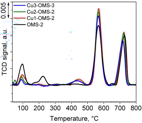 O2-TPR profiles of the investigated catalyst series are presented in Figure 6. The pristine OMS-2 catalyst exhibited four desorption peaks with maximum at 98, 226, 568, and 730 °C. First peak can be assigned to both weakly adsorbed molecular oxygen as well as to surface oxygen species (Osurface). The second one is related to chemically adsorbed oxygen (Oadsorbed) [13,32,33]. Peaks at 568 and 730 °C were identified as oxygen released from the framework (Olattice-surface and Osurface-bulk) [13]. It can be seen that introduction of copper during the synthesis stage caused noticeable changes in the share of oxygen species released during the O2-TPD process. The share of loosely bonded oxygen species released at lower temperatures lowered with increasing content of Cu within the material. However, the share of the Olattice-surface species was significantly higher when the Cu loading decreased. Also, the highest amount of Olattice species was obtained for Cu1-OMS-2, implying changes in the chemical composition of the obtained catalyst. An additional release of oxygen was observed for all the Cu-doped samples and was located at around 450 °C and was also the greatest for Cu1-OMS-2, hence implying improved surface oxygen spillover of the Cu-doped materials [34].
