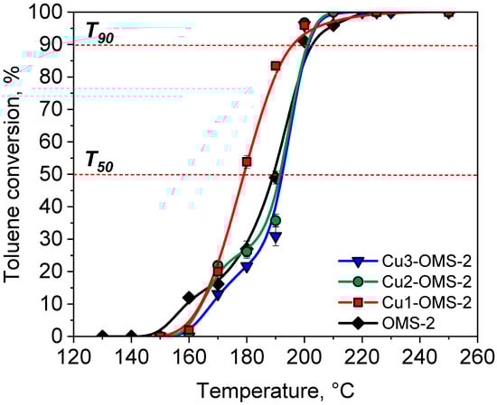The results of toluene combustion over investigated catalysts are presented in Figure 7. The carbon balance during toluene combustion over investigated catalysts was summarized in Table S2. All the investigated catalysts start to be active at 160–170 °C. It can be seen that the parent OMS-2 catalyst represented the fastest start of the reaction with a conversion of about 12%. Such phenomenon can be caused by greater share of loosely bonded oxygen molecules for OMS-2 material, which could promote initial activity of the catalyst, as evidenced by O2-TPD (Figure 6). At 170 °C all catalysts showed activity from 13 to 20%. The Cu-doped materials (Cu1-OMS-2 and Cu2-OMS-2) were at this temperature more active than OMS-2 and Cu3-OMS-2. Further increase in the reaction temperature showed great differences between the oxidation of toluene, for which Cu1-OMS-2 showed >50% toluene conversion at about 180 °C, whereas for other catalytic systems, this value was obtained >190 °C. Also, the T90 (temperature of 90% toluene conversion) was obtained at the lowest temperature for Cu1-OMS-2 catalyst. At 210 °C all investigated catalysts demonstrated 100% toluene conversion. It can be hence concluded that the activity of the catalysts was, rather, not related to the specific surface area (see Table 1), as despite possessing the lowest SBET of 58.6 m2 g−1, Cu1-OMS-2 was the most active catalyst among the investigated series. The major differences appeared in O2-TPD profiles, for which the share of surface oxygen was evidenced to be the highest for Cu1-OMS-2. These oxygen species do not directly take place in this reaction as their desorption temperatures were found to be much above the toluene combustion temperatures (568 and 730 °C). Herein presented combustion temperatures (T90) of the investigated samples are just 20 °C higher than those reported in work of Jarczewski et al. [35], where Pt-based ceria oxide catalysts were investigated, implying an opportunity to obtain sufficient catalytic activity for noble metal-free catalytic systems.