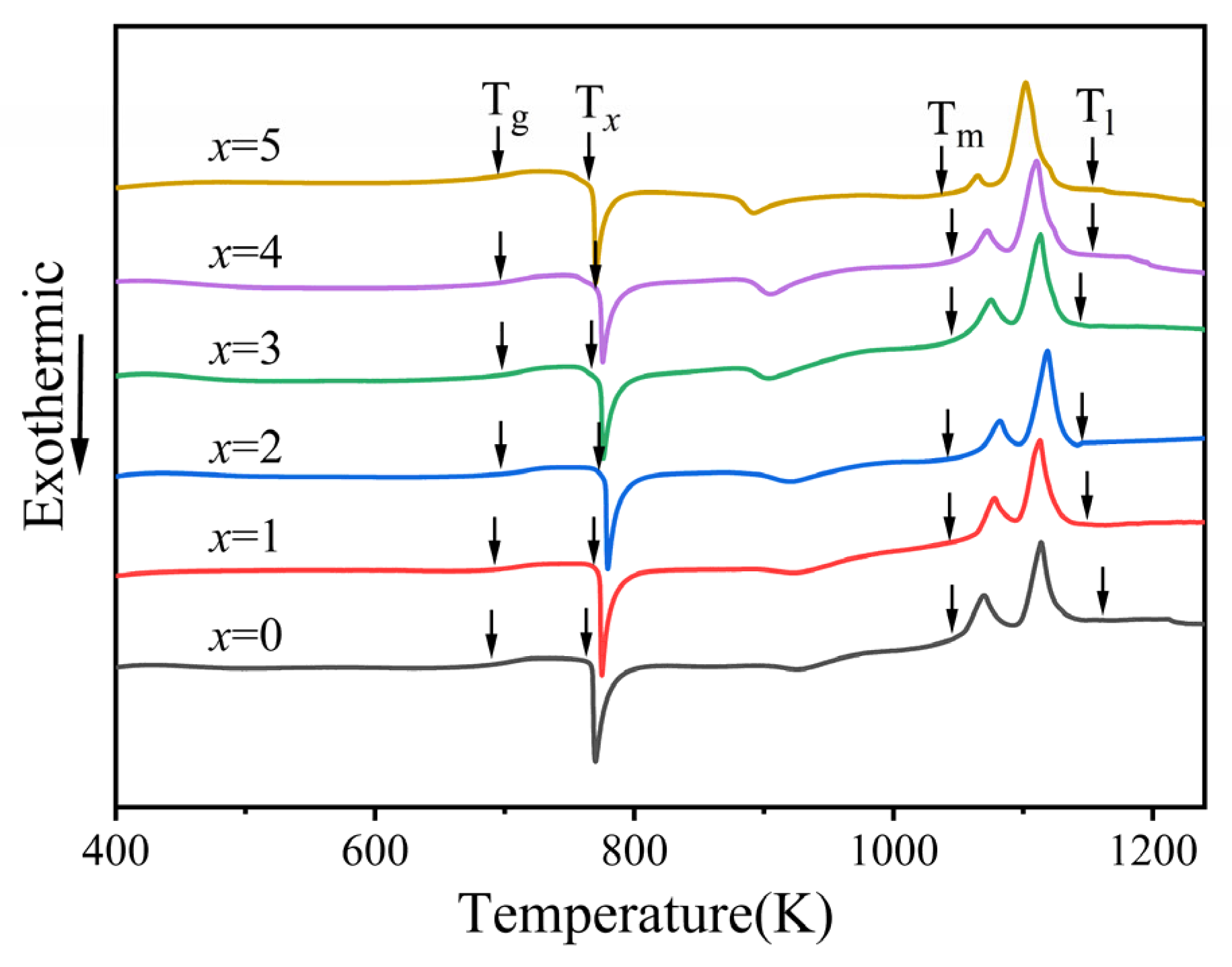 | Content of Ta | Tg (K) | Tx (K) | Tm (K) | Tl (K) | ΔT (K) | Trg | γ |