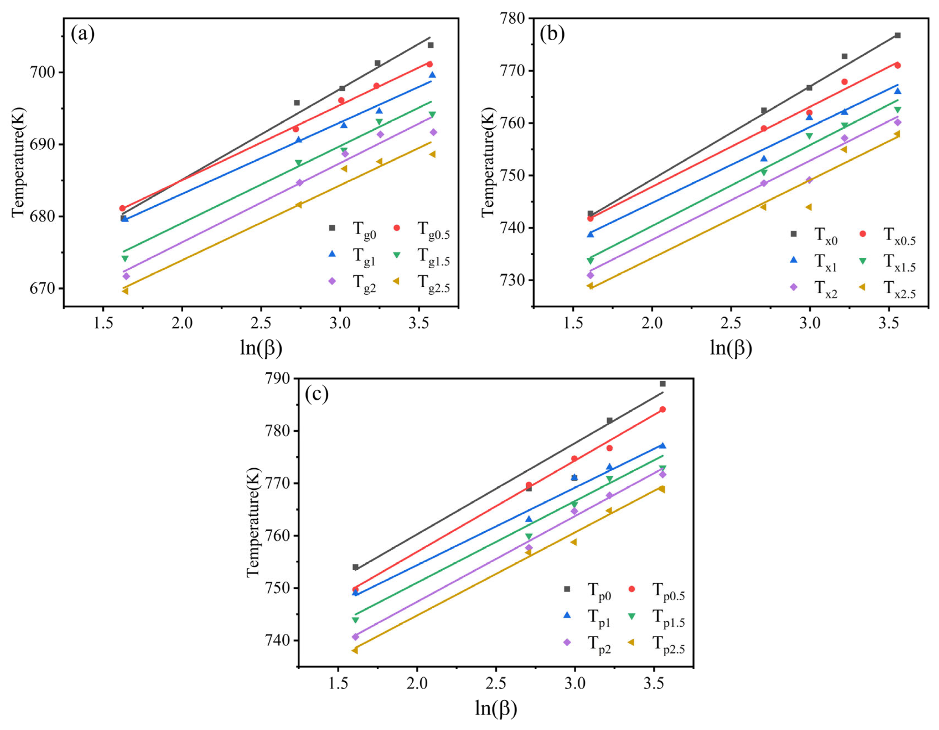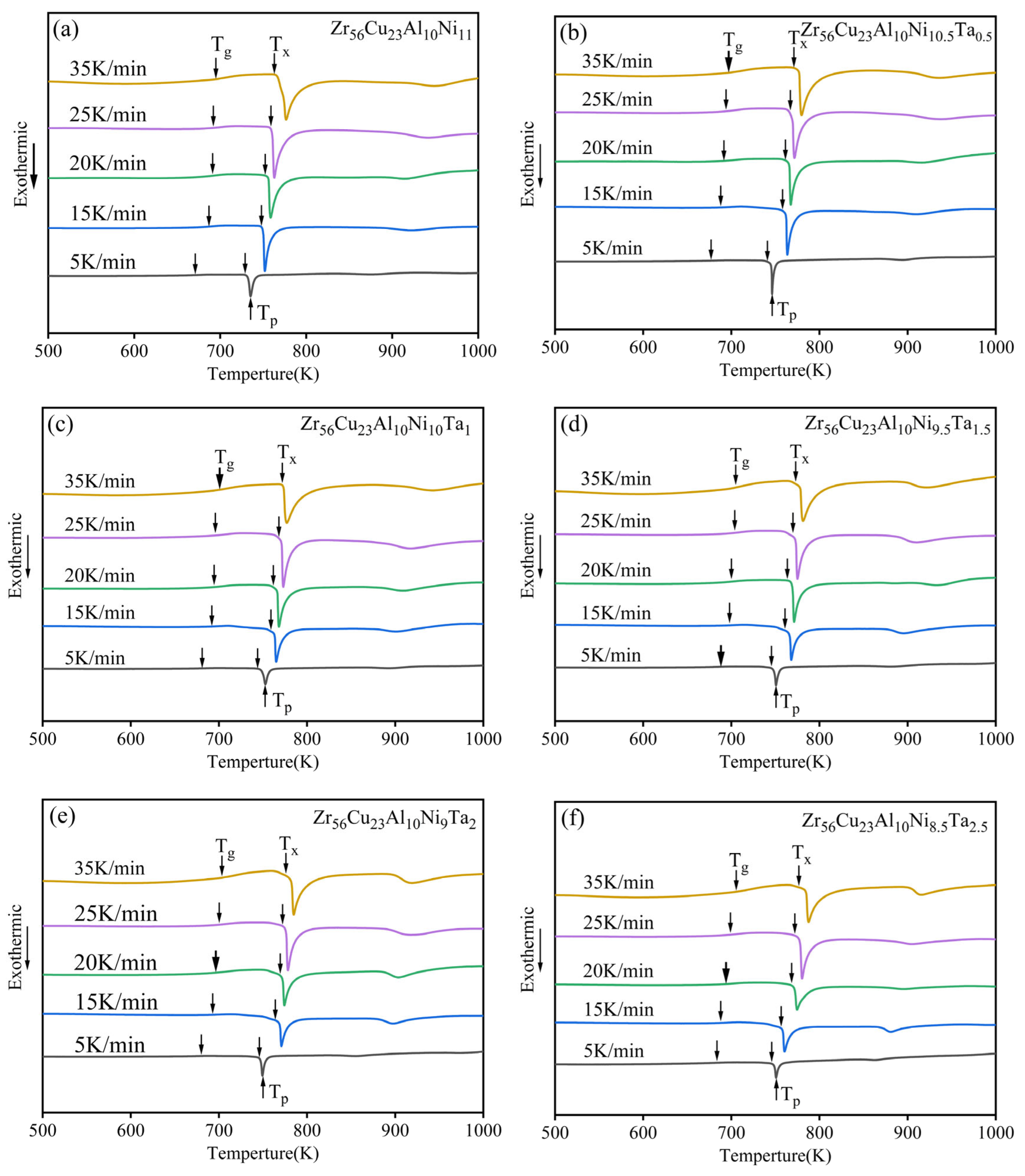 | Content of Ta | β | Tg (K) | Tx (K) | Tp (K) | ΔT (K) |