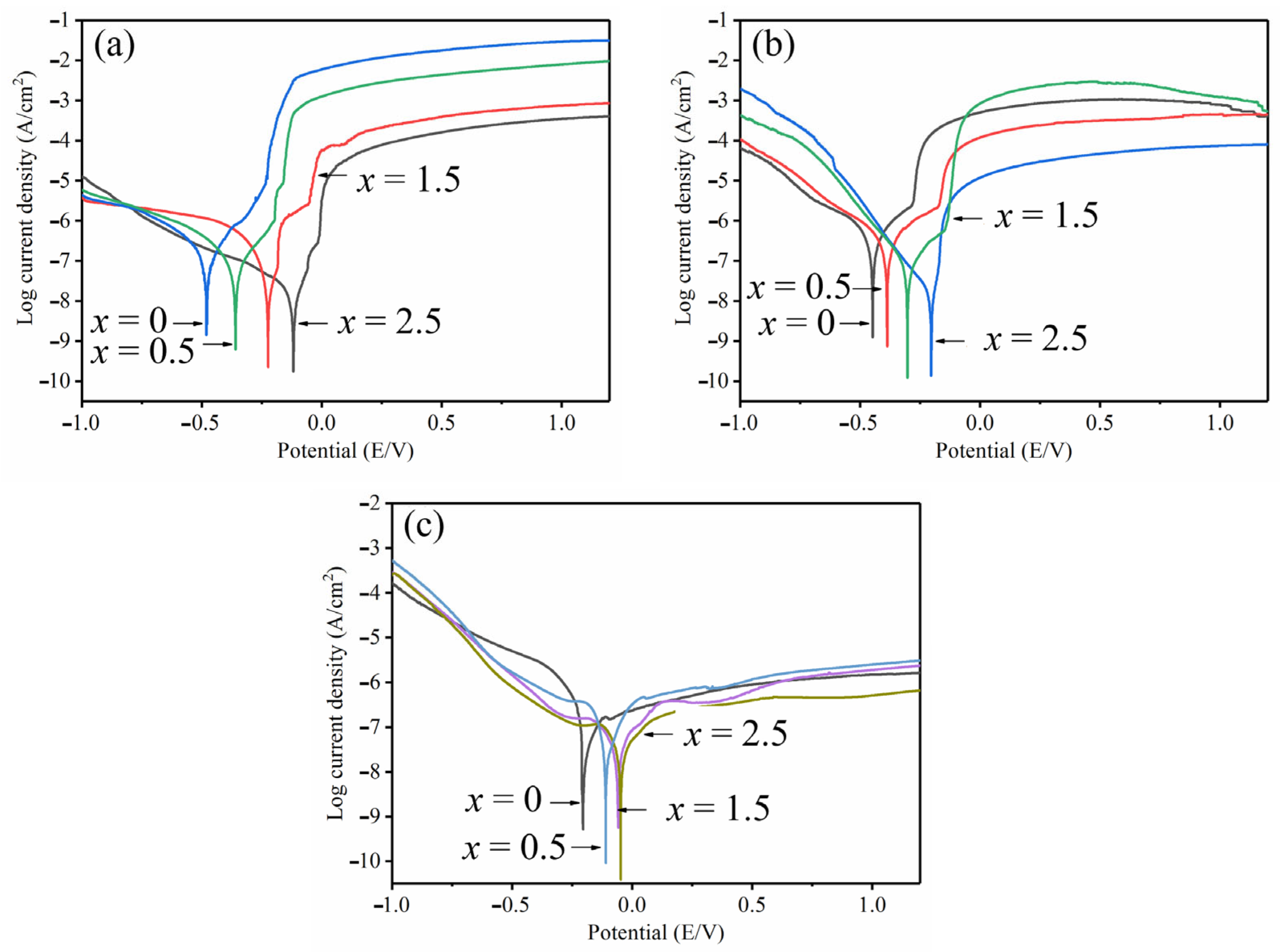 - At x = 2.5, the highest corrosion potential in 1 mol/L HCl reached −278 mV, and the lowest corrosion current density was 7.9 × 10−8 A/cm2 (reduced by an order of magnitude when compared to original amorphous alloy). In 0.6 mol/L NaCl solution, the maximum corrosion potential was recorded as −142 mV, and the minimum corrosion current density was 6.3 × 10−8 A/cm2. Hence, obvious passivation took place in 1 mol/L H2SO4 solution with the lowest corrosion current density estimated to 2.5 × 10−8 A/cm2. Overall, the addition of Ta improved the corrosion resistance of Zr–Cu–Al–Ni amorphous alloy.
