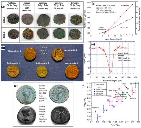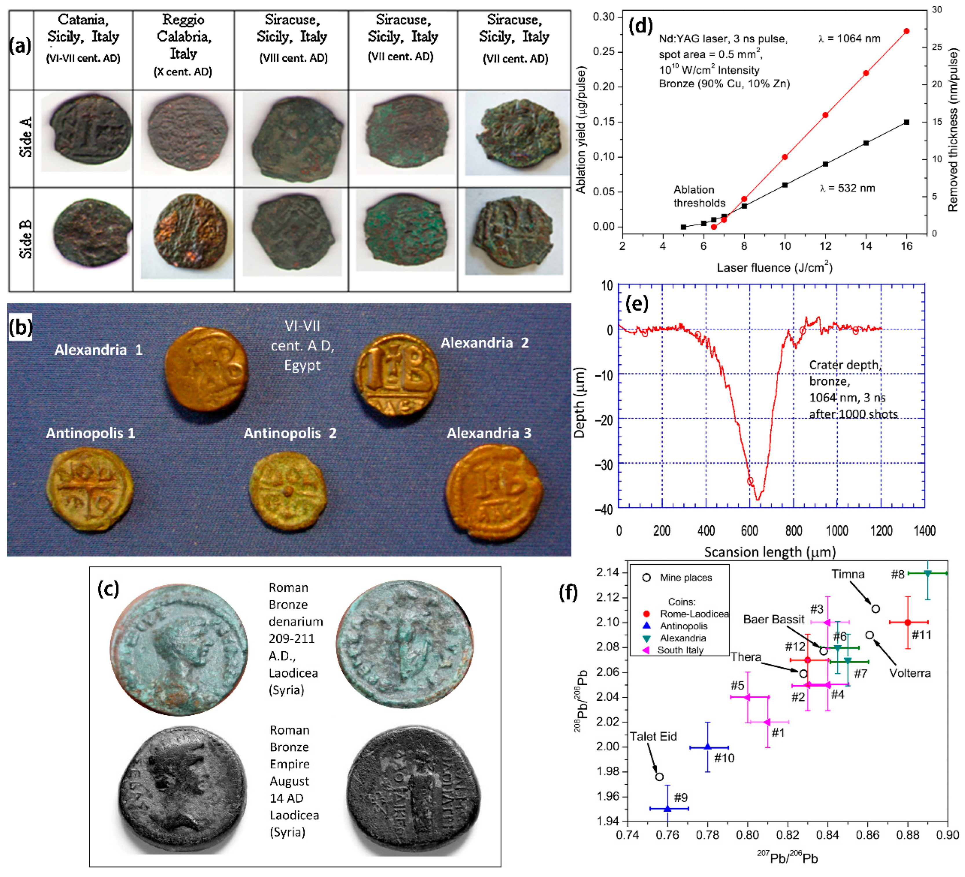 - Torrisi, L.; Italiano, A.; Torrisi, A. Ancient bronze coins from Mediterranean basin: LAMQS potentiality for lead isotopes comparative analysis with former mineral. Appl. Surf. Sci. 2016, 387, 529–538. [Google Scholar] [CrossRef]