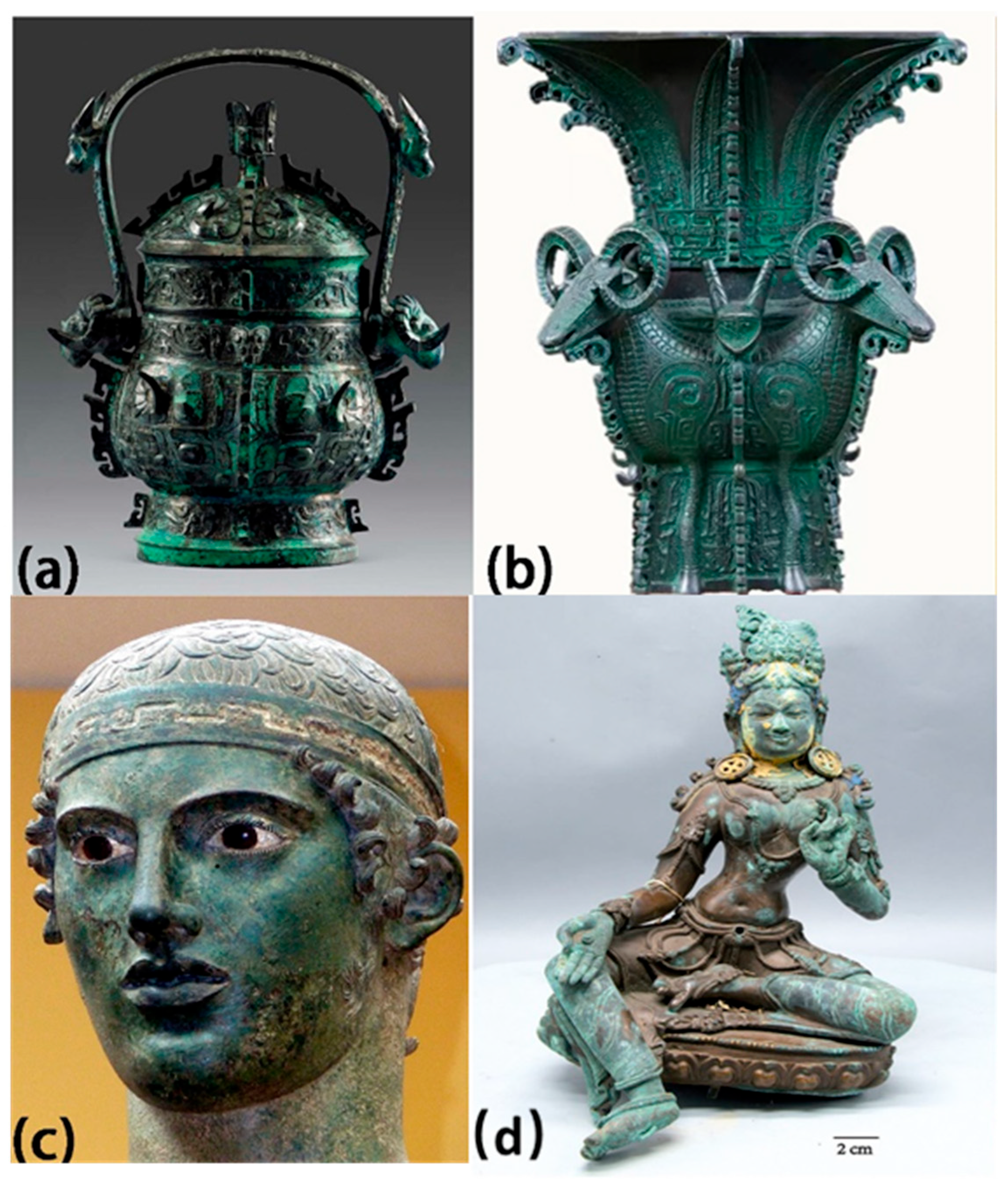- Quaranta, M.; Catelli, E.; Prati, S.; Sciutto, G.; Mazzeo, R. Chinese archaeological artefacts: Microstructure and corrosion behaviour of high-leaded bronzes. J. Cult. Herit. 2014, 15, 283–291. [Google Scholar] [CrossRef]