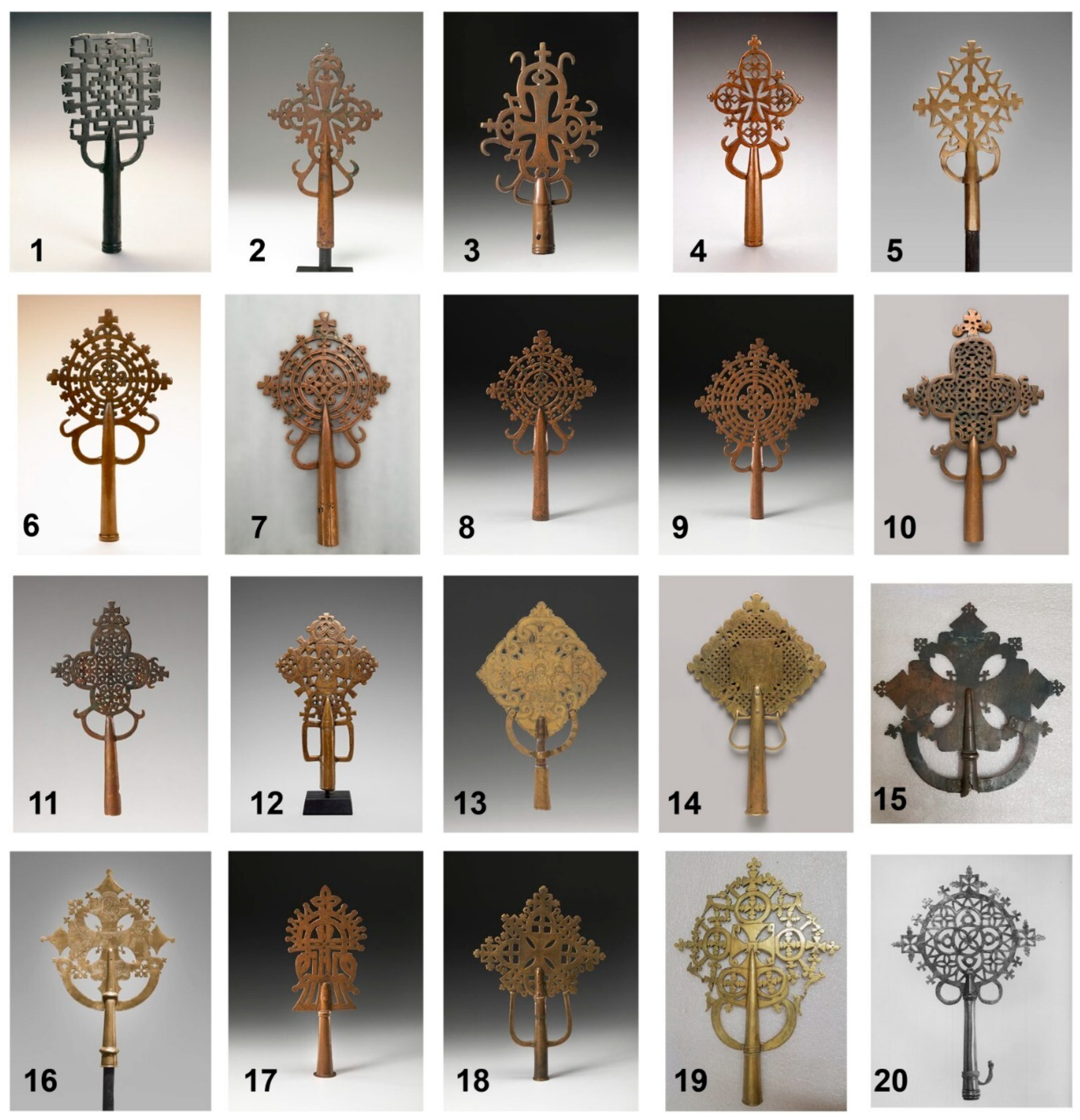 - Harrison, A. Technical Study of Ethiopian Copper Alloy Processional Crosses Using Non-Destructive Analysis. Stud. Conserv. 2022, 67, 459–471. [Google Scholar] [CrossRef]