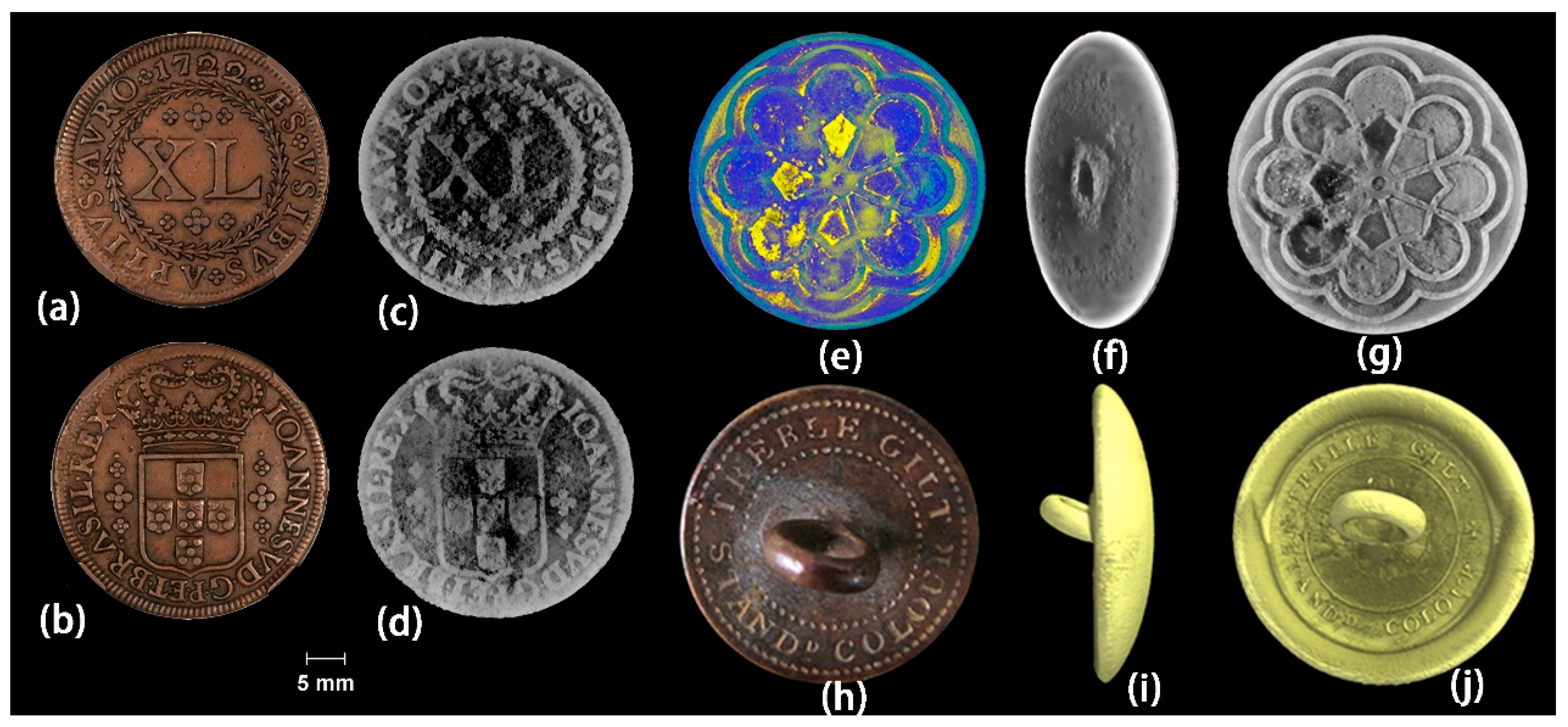 - Bude, R.O.; Bigelow, E.M.R. Nano-CT evaluation of totally corroded coins: A demonstration study to determine if detail might still be discernible despite the lack of internal, non-corroded, metal. Archaeometry 2020, 62, 1195–1201. [Google Scholar] [CrossRef]