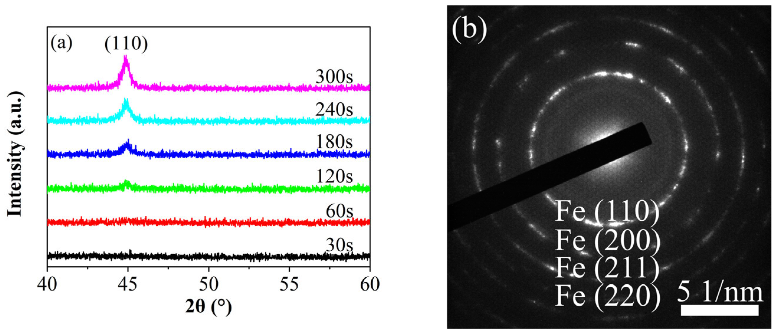 - Du, J.; Li, G.; Wang, Q.; Ma, Y.; Cao, Y.; He, J. Microstructural Evolution and Magnetic Properties of Nanocrystalline Fe Films Prepared in a High Magnetic Field. Vacuum 2015, 121, 88–95. [Google Scholar] [CrossRef]