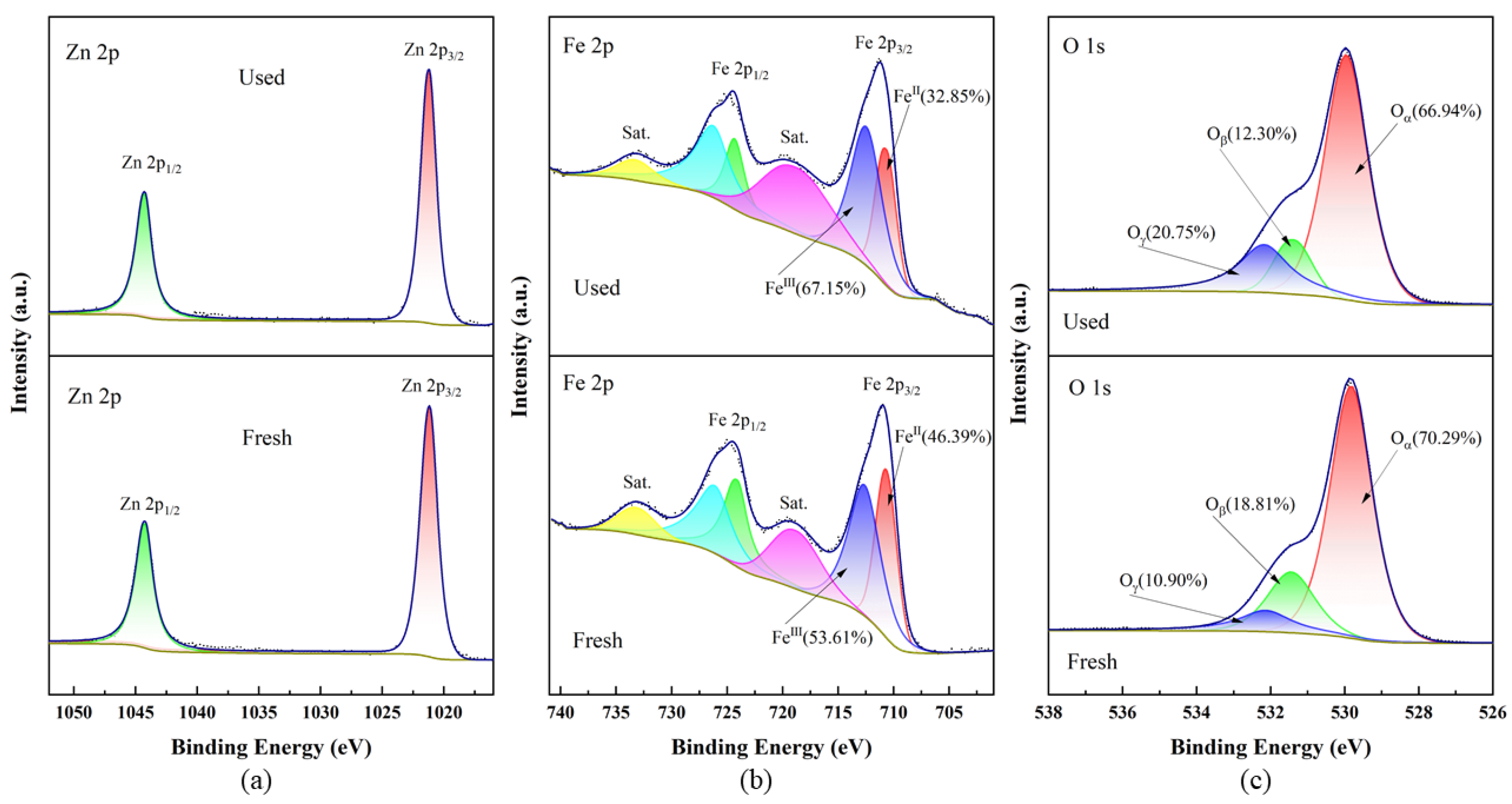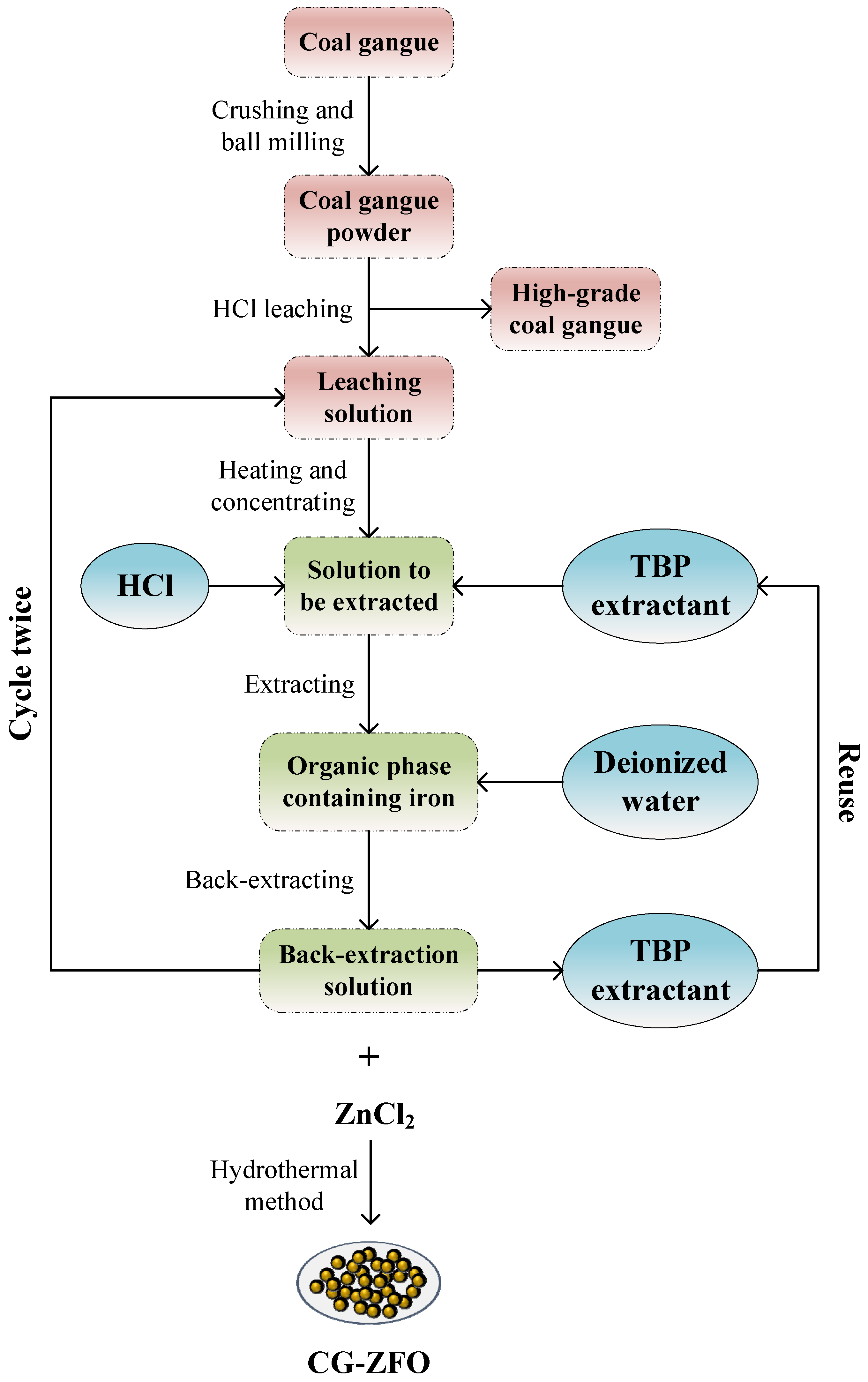 - Through activation and acid leaching processes, Fe2O3 in the coal gangue was effectively removed. Subsequently, the leaching solution was subjected to extraction using tributyl phosphate (TBP) followed by back-extraction with deionized water. This series of operations increased the iron (Fe) concentration in the solution from 46.29% to 99.64%, making it a feasible iron source for the synthesis of the ZnFe2O4 catalyst.