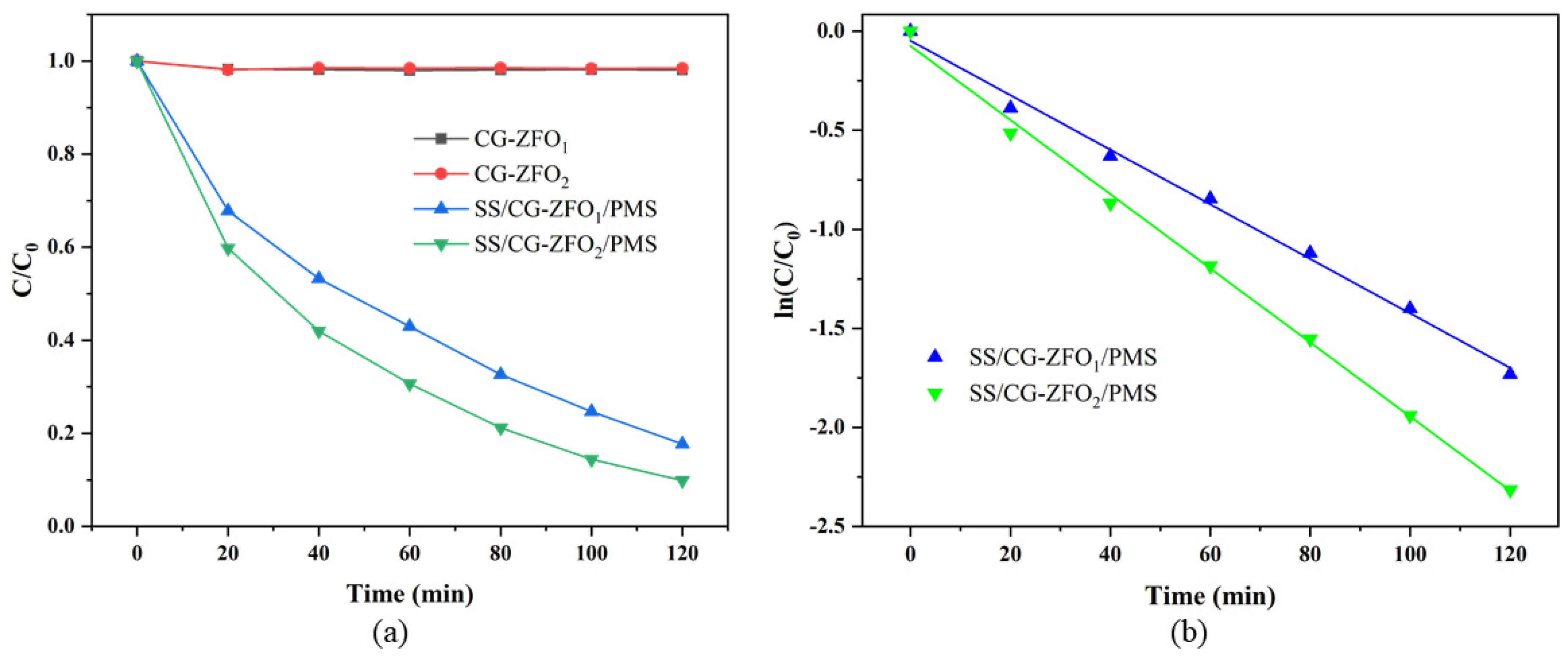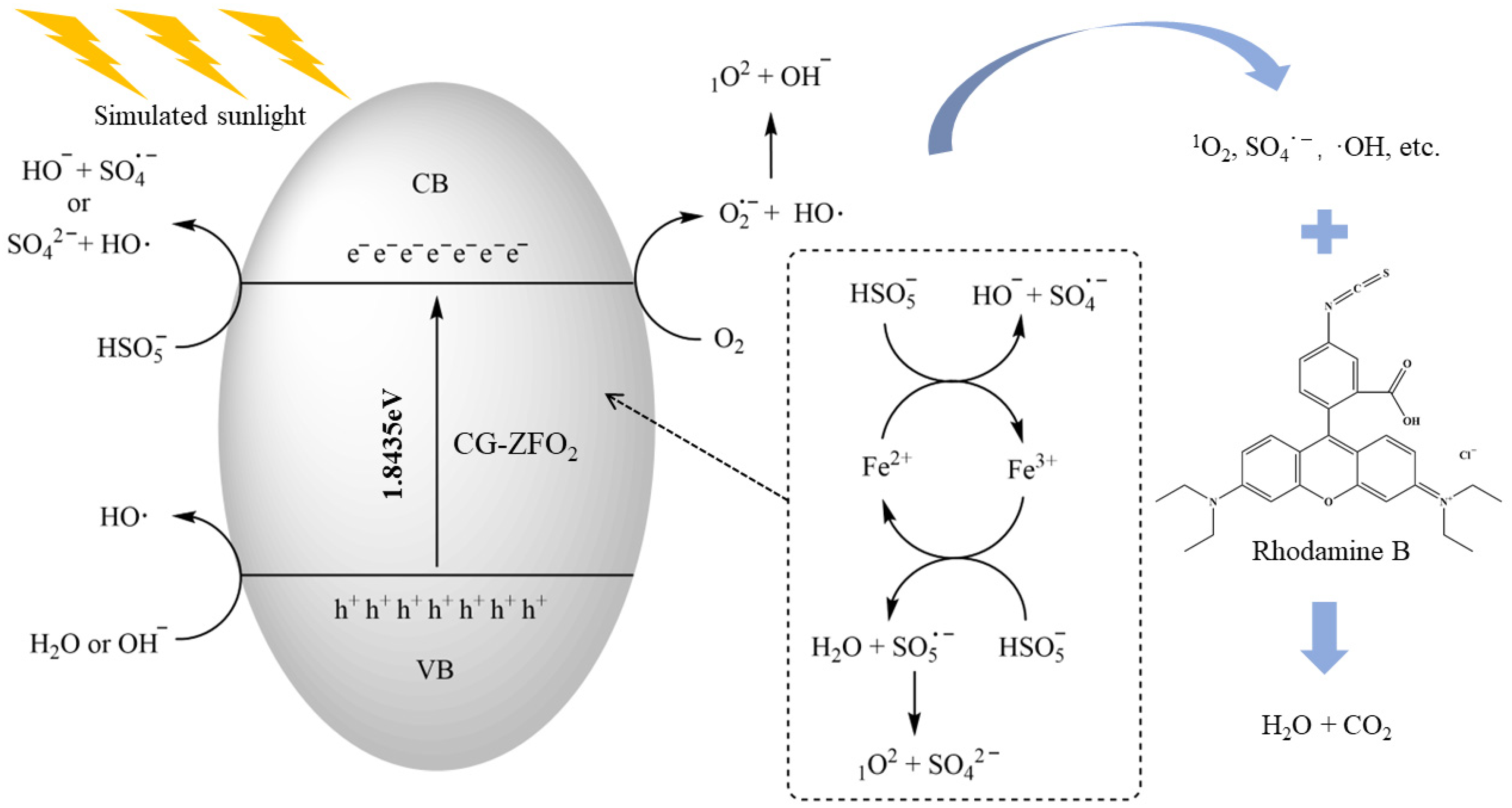 - Combining the conclusions of radical-quenching experiments, EPR, and XPS, it was determined that in the SS/CG-ZFO2/PMS catalytic system, 1O2 was the main active species. The CG-ZFO2 catalyst mainly relies on the FeII/FeIII redox cycle and the generation of photo-generated electron-holes to promote the activation of PMS for the degradation of RhB.
