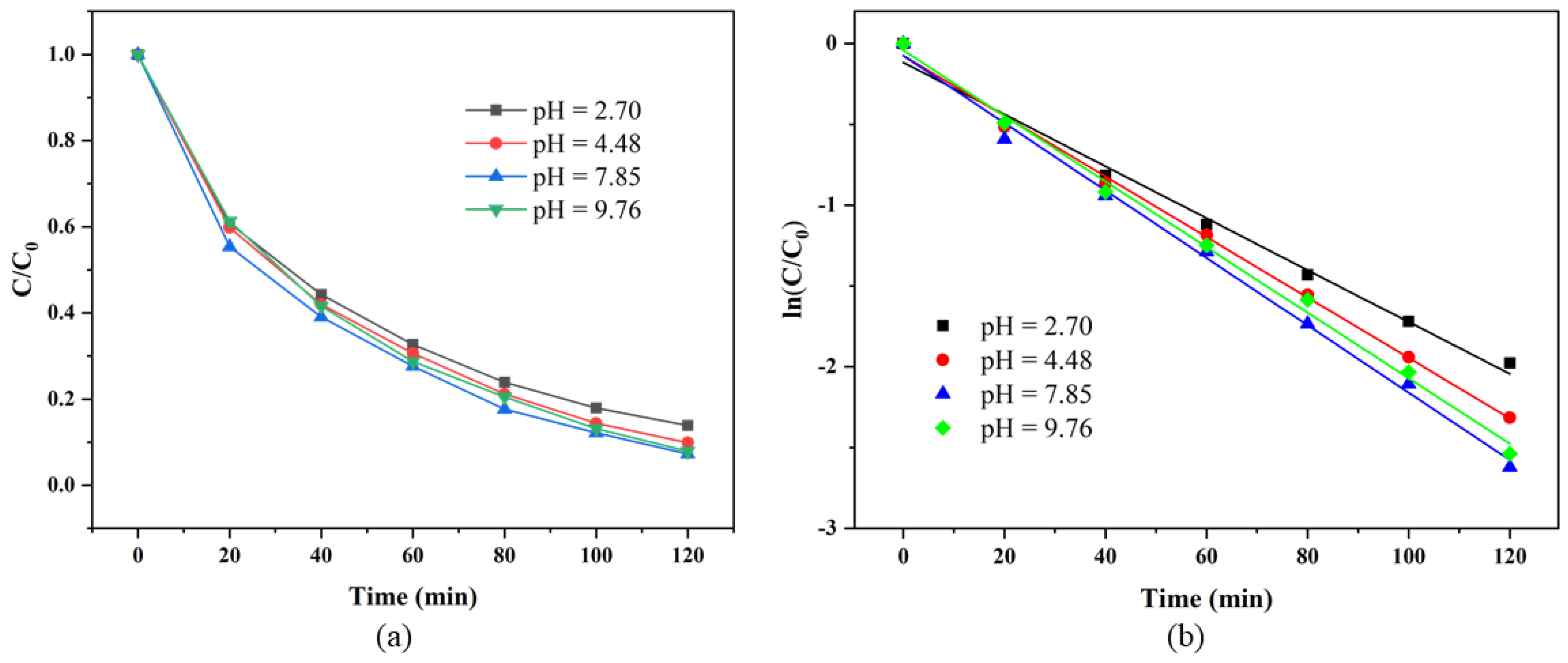 3.3.3. Effects of Initial pH on RhB Degradation