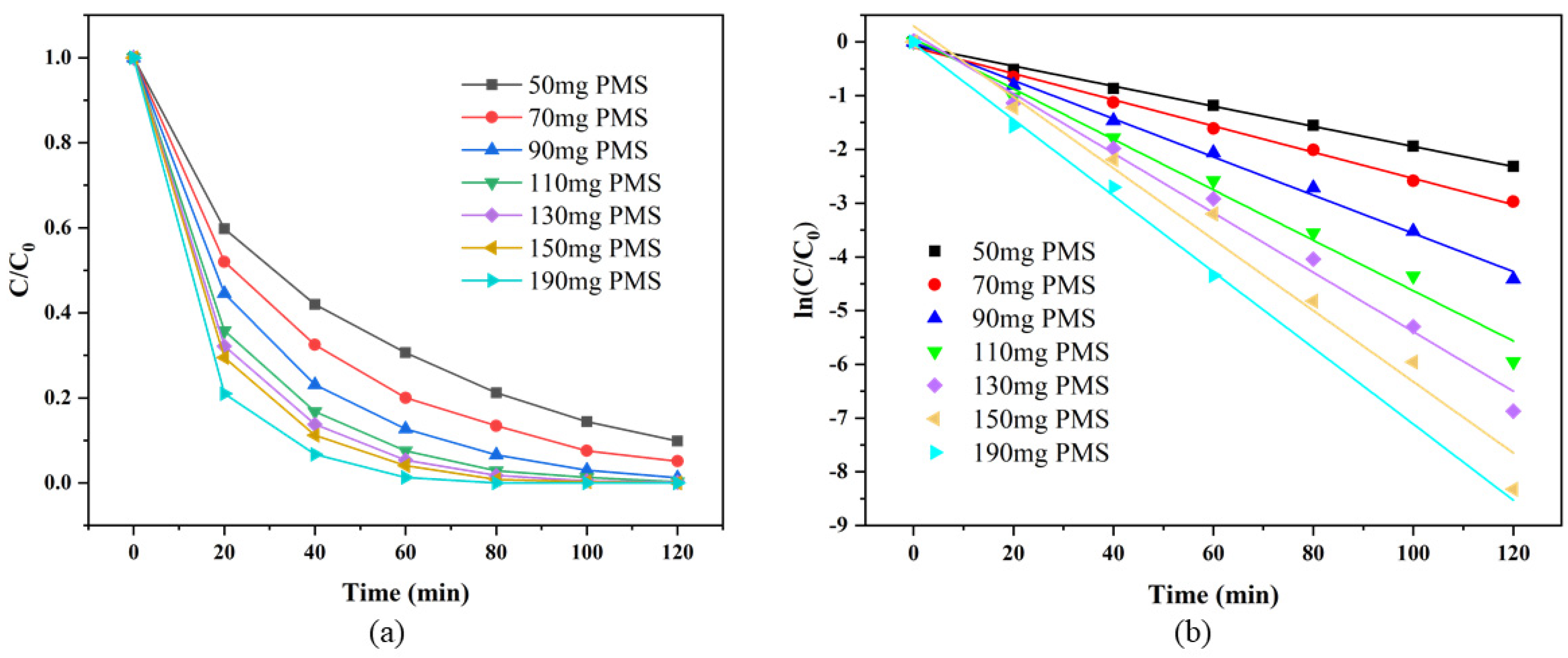 3.3.4. Effects of PMS Dosage on RhB Degradation