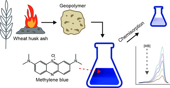 - Elewa, K.; Tawfic, A.F.; Tarek, M.; Al-Sagheer, N.A.; Nagy, N.M. Removal of Methylene Blue from Synthetic Industrial Wastewater by Using Geopolymer Prepared from Partially Dealuminated Metakaolin. Sci. Rep. 2025, 15, 17633. [Google Scholar] [CrossRef]