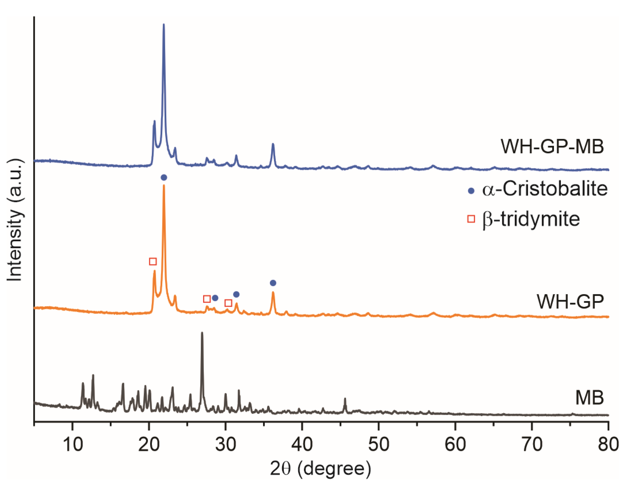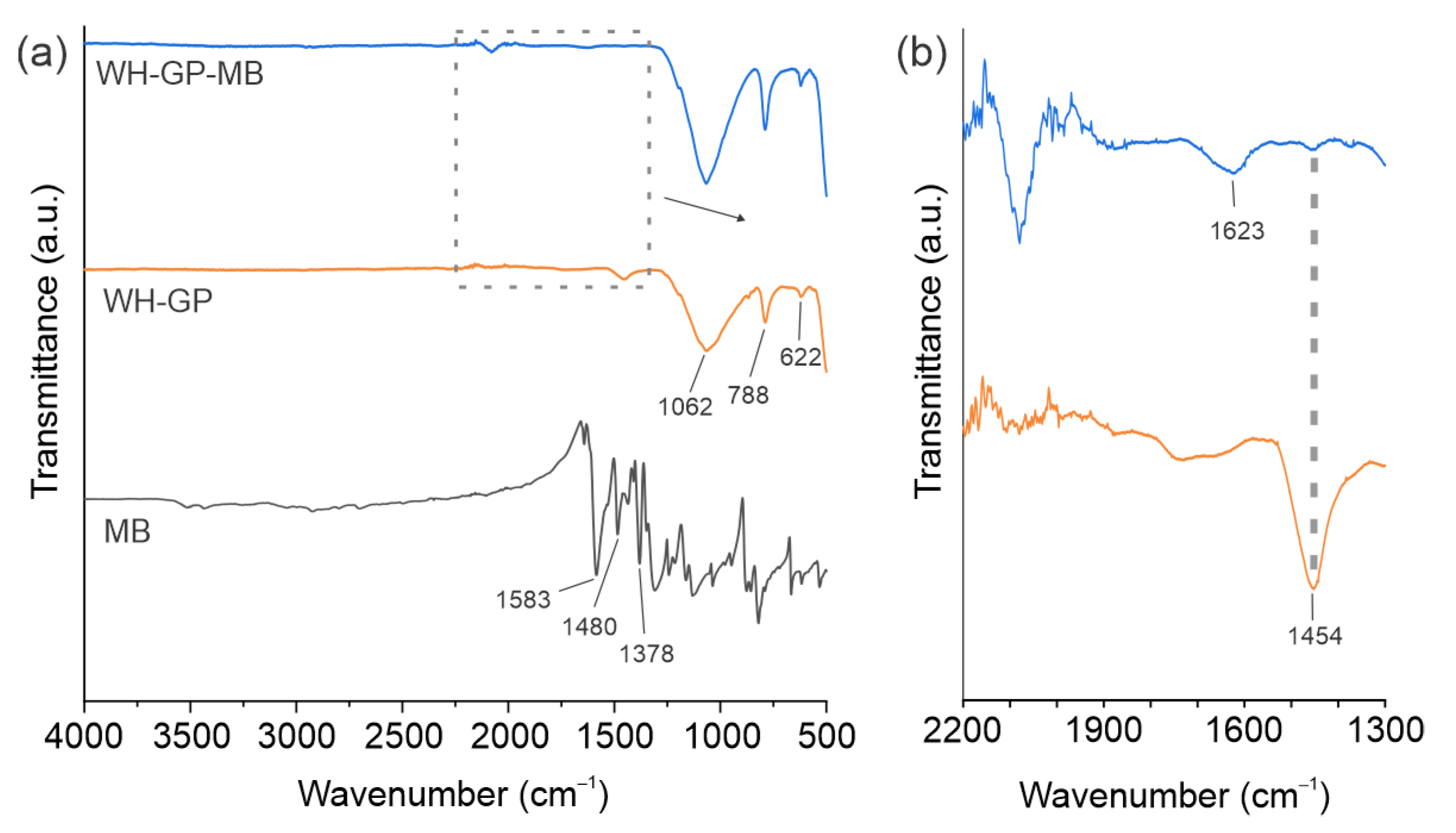 - Rapid initial electrostatic attraction: Under the alkaline conditions generated by NaOH/Na2SiO3, the WH-GP surface develops a high density of negative charges (=Si–O−) due to the deprotonation of oxygen groups. This promotes the rapid initial capture of MB+ ions, primarily driven by electrostatic attraction. This step is often accompanied by ion exchange, in which Na+ ions associated with the WH-GP surface are exchanged for MB+ ions as MB+ approaches. The Cl− counterion of the dye does not participate in the anchoring and remains in solution.