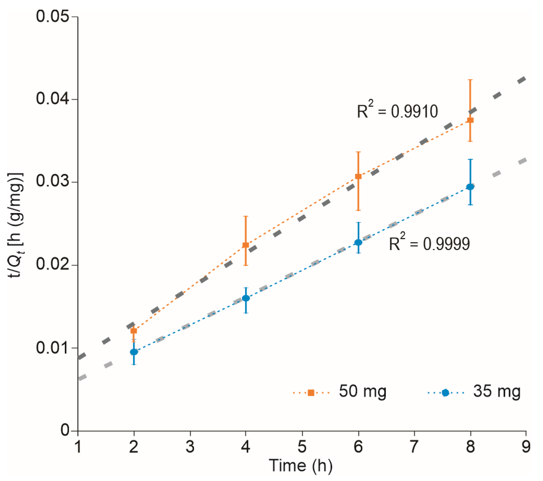 | Method (w AM (mg)) | k2 × 10−3 (g/(h mg)) | qe,cal (mg/g) | qe,exp (mg/g) | Removal (%) |