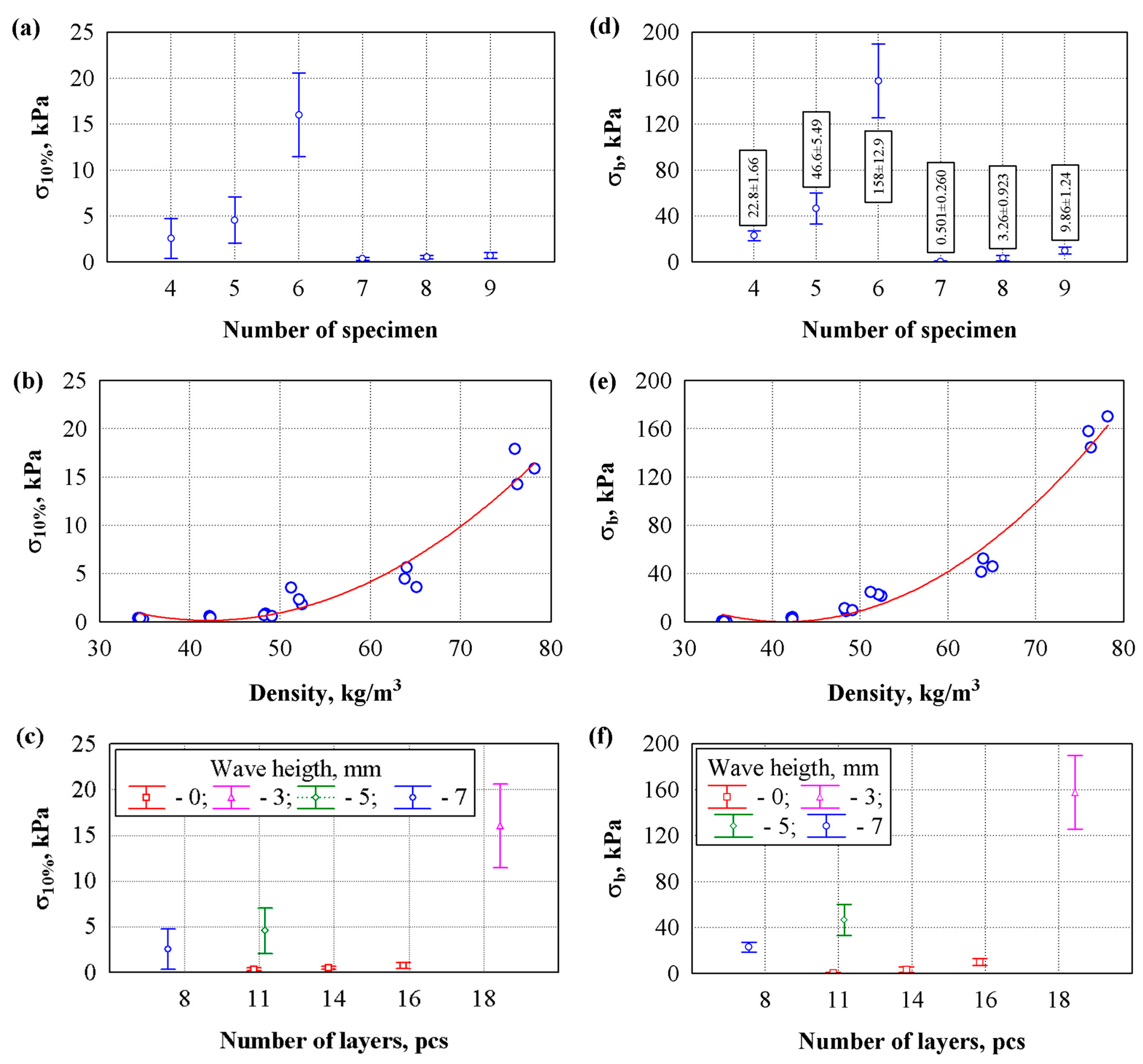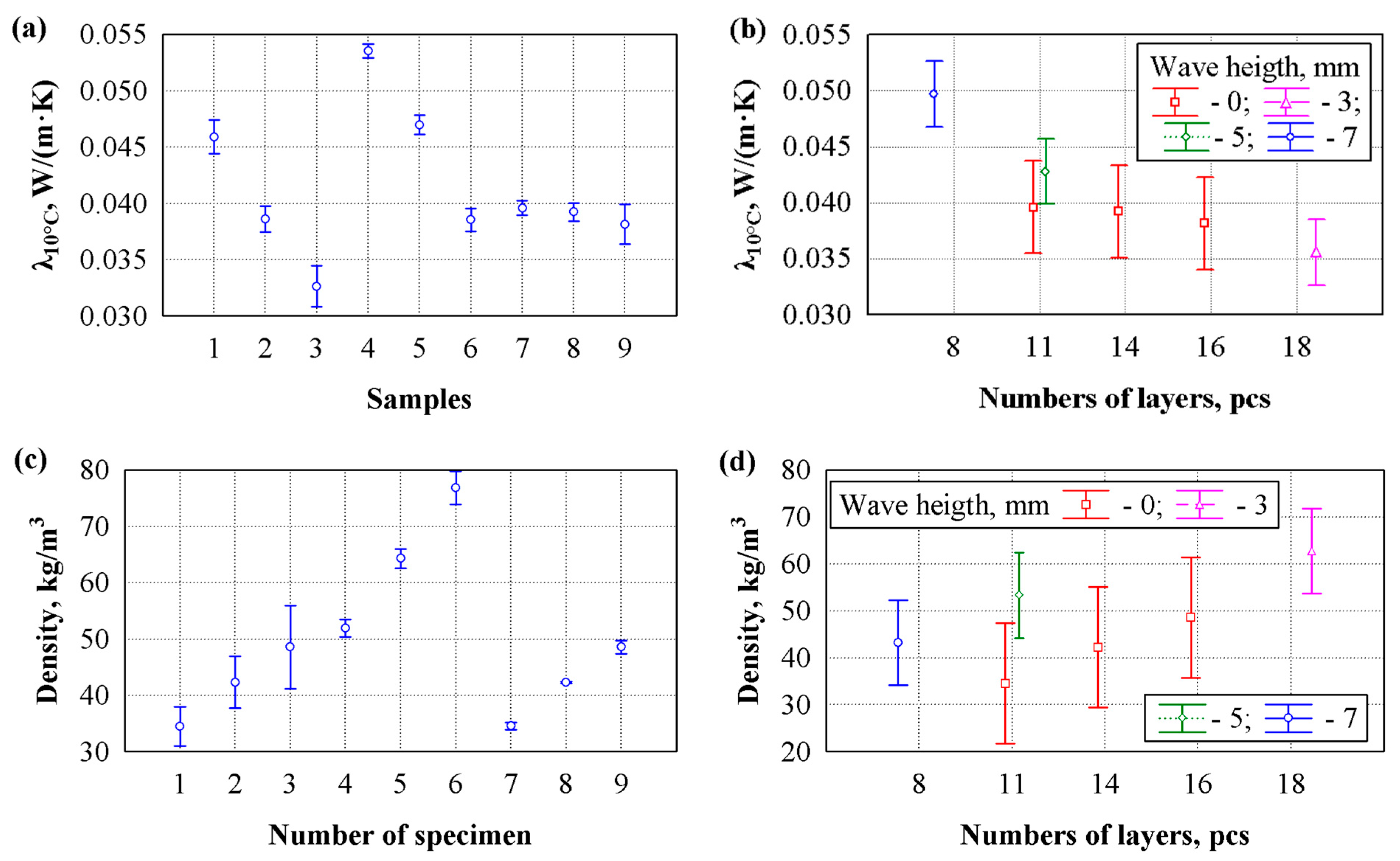 | Group of Specimens | Form of Specimen | Number of Layers, pcs | Wave Height, mm | Thickness, mm | Density, kg/m3 | Thermal Conductivity, W/(m·K) |