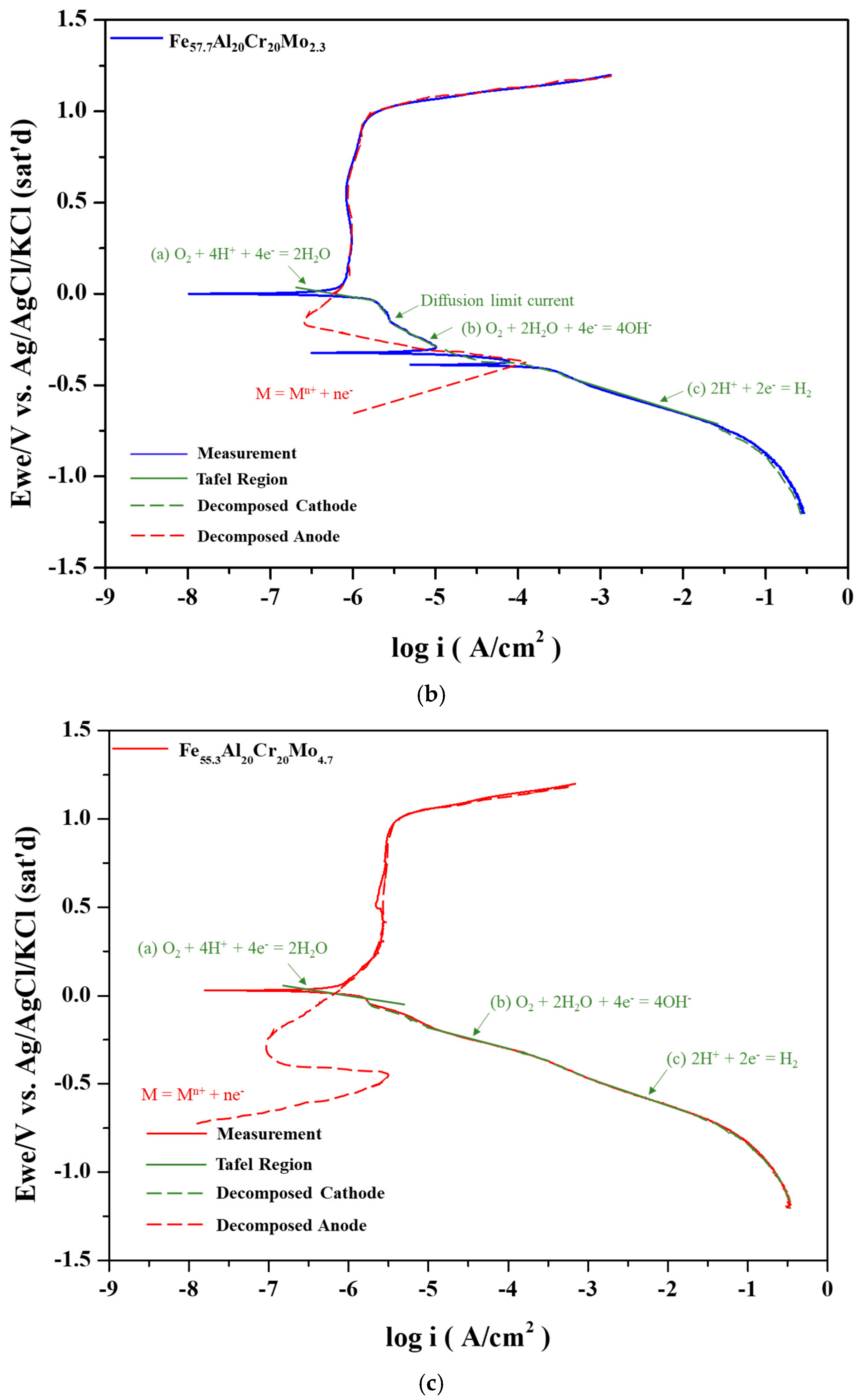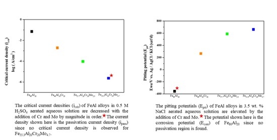 In the Fe–Al system, the polarization curve exhibits only a single corrosion potential since both the critical current density and passive current density are relatively high. However, upon the addition of Cr, the critical current density decreases significantly, and the passivation occurs rapidly, resulting in the intersection with the cathodic polarization curve of O