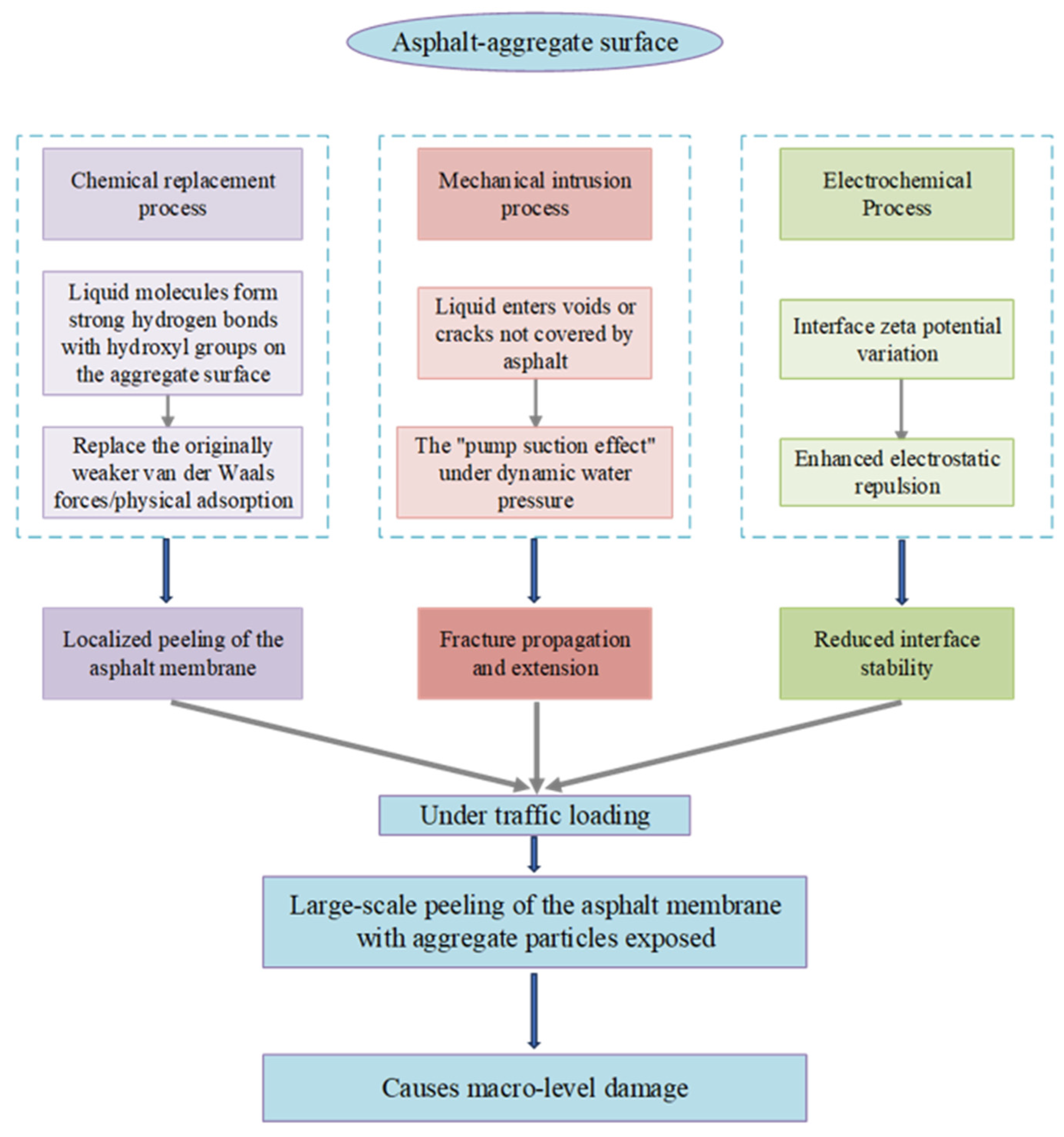 | 90# base asphalt, basalt; limestone powder | Chloride salts; sulphate salts; hydrostatic scouring | Dynamic water scouring/wet–dry cycling/freeze–thaw cycling; pull-out tests; normal-temperature/low-temperature splitting tests | Dynamic water scouring is more detrimental to adhesion than static erosion, with pull-off strength showing a significant negative correlation to freeze–thaw cycles. This weakening of the asphalt–aggregate bond heightens susceptibility to water damage [59]. |