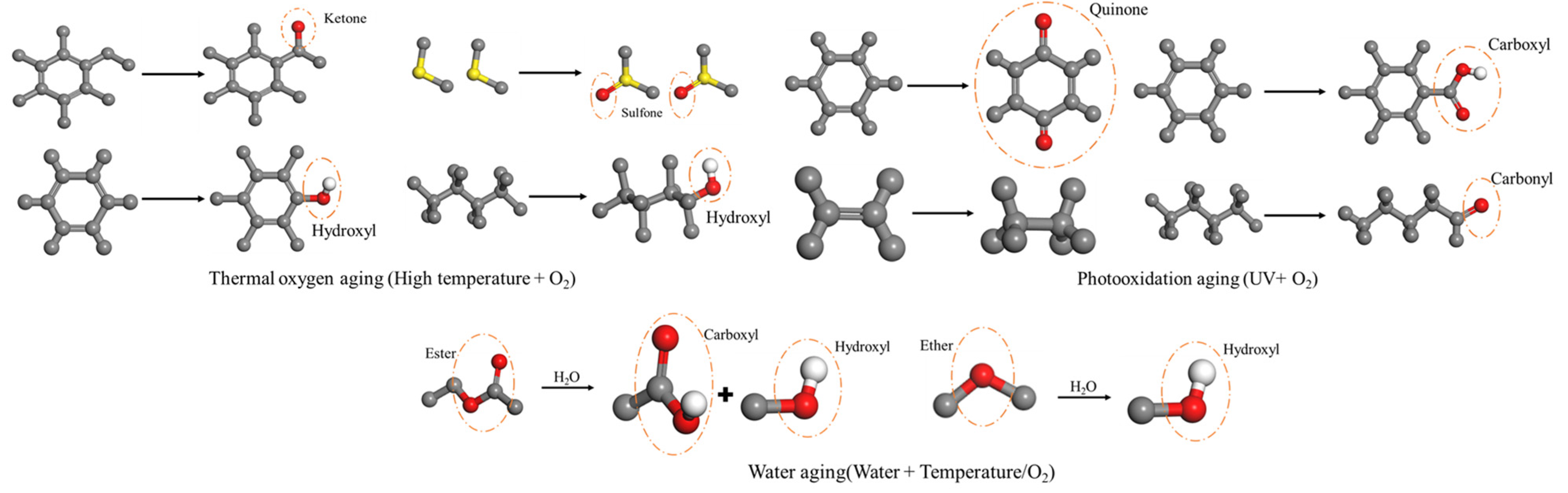| High-viscosity modified asphalt; basalt; limestone mineral powder | Water; thermal-oxygen aging environment | Rotational viscosity testing; surface tension; FTIR testing | Although the combined effect of moisture and thermal oxidation initially increases asphalt viscosity, prolonged aging still degrades mechanical properties, primarily as a function of water content [60]. |